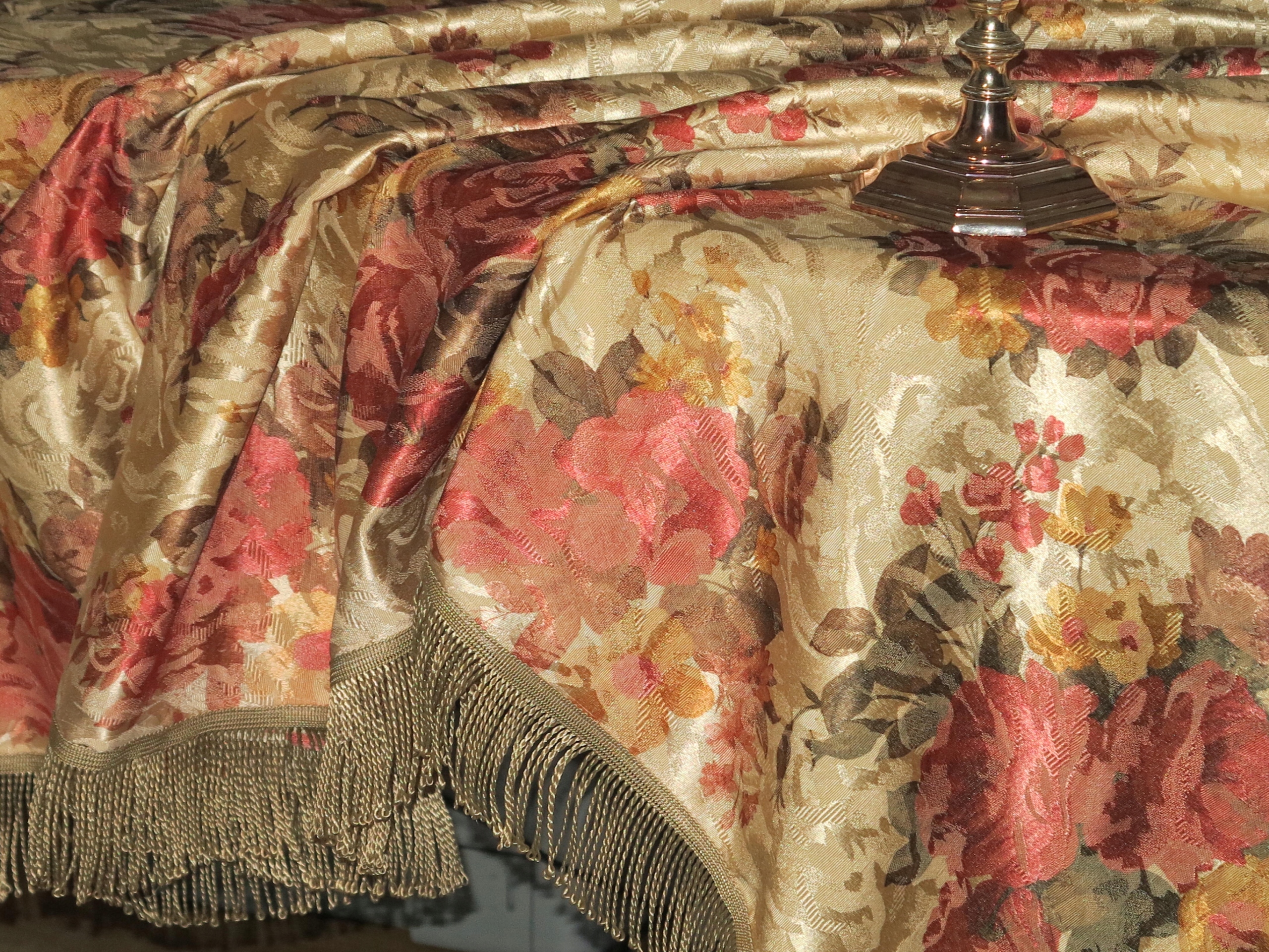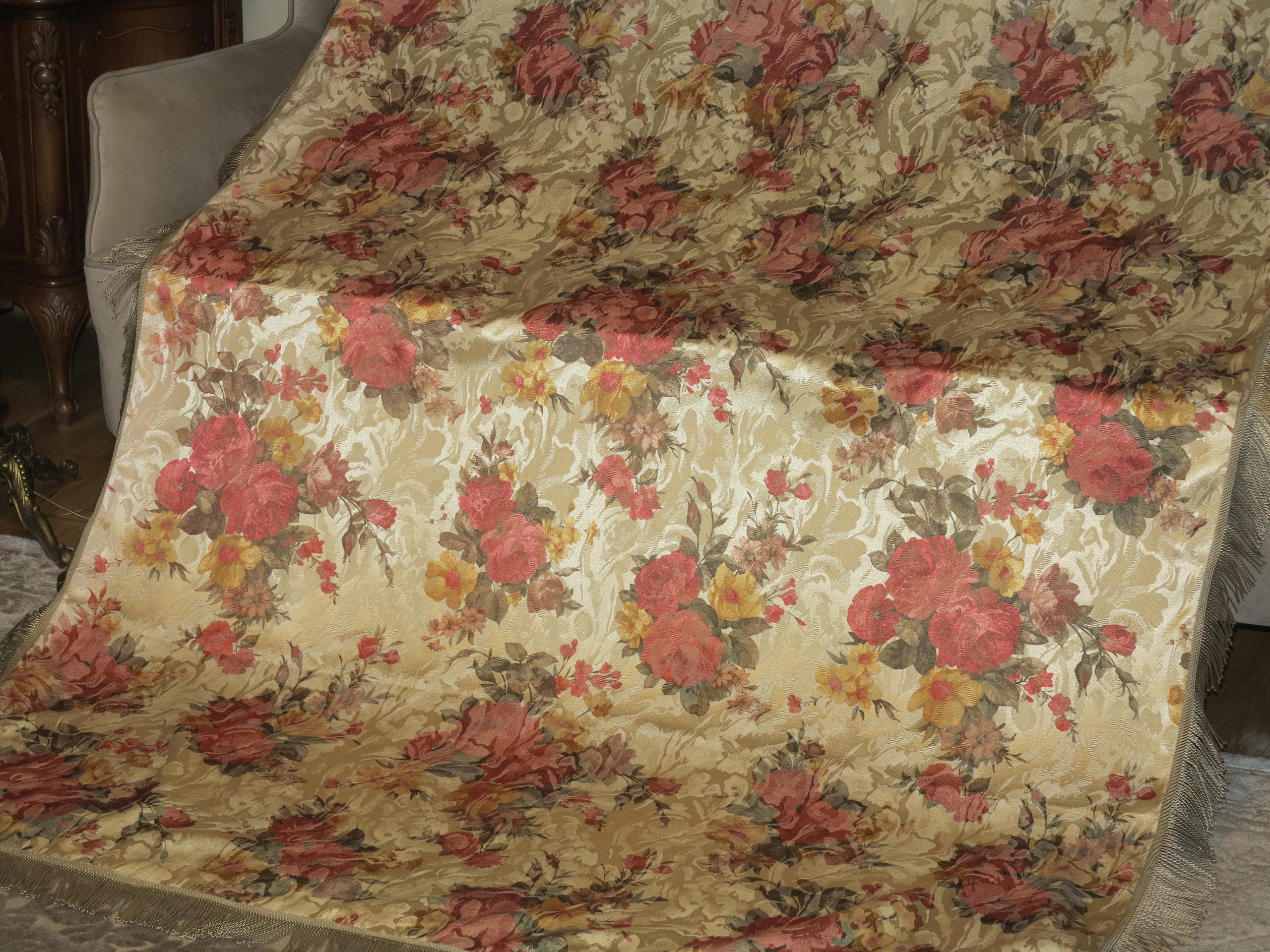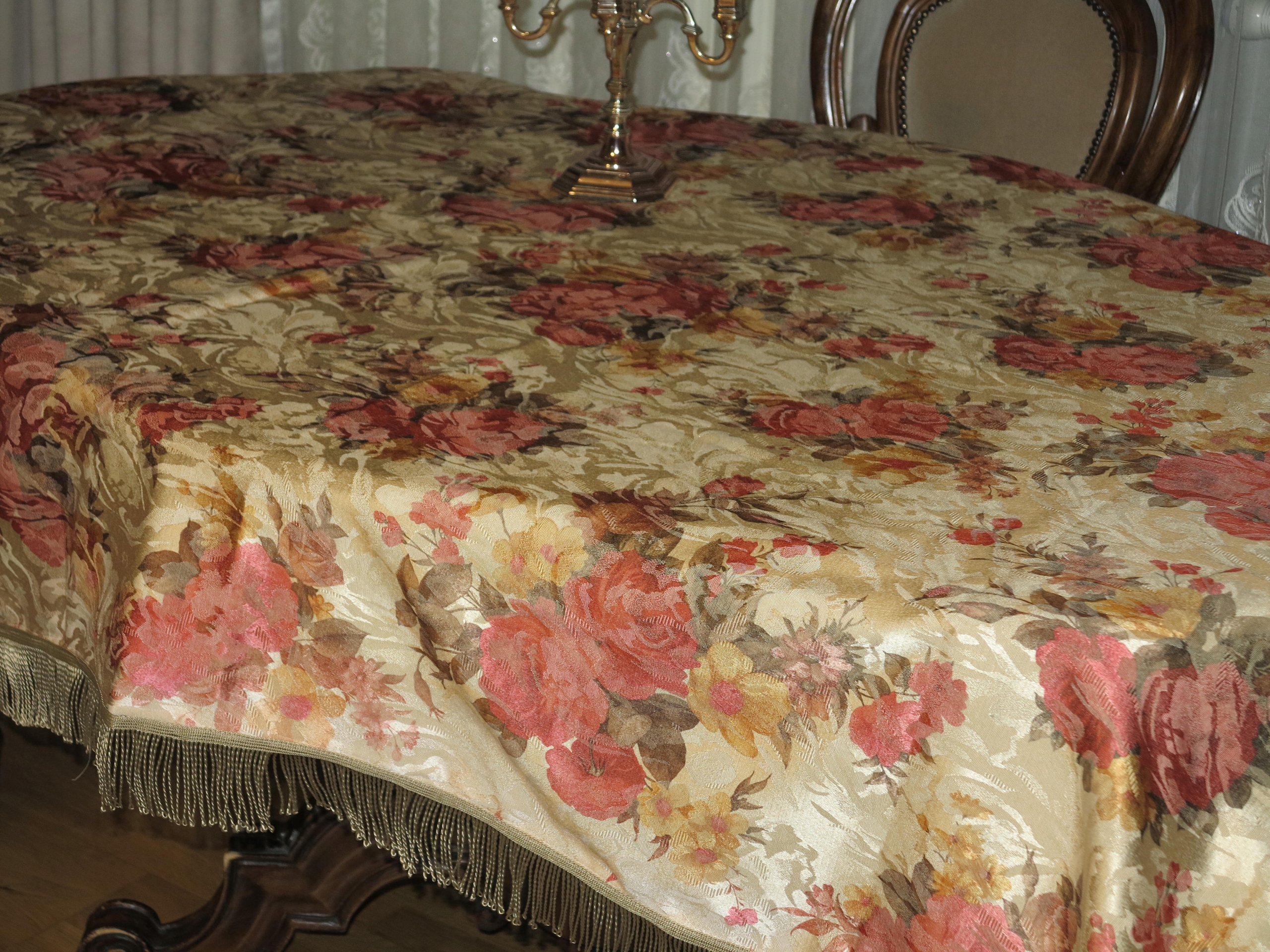 ЧУДОВУ АНГЛІЙСЬКУ СКАТЕРТИНУ З ВЕЛИКИМИ КВІТКОВИМИ БУКЕТАМИ, ОБРОБЛЕНИМИ ДОВГИМИ ЗОЛОТИМИ БАХОМКАМИ. НА ТКАНИНІ Є ДОДАТКОВО НАШТАПОВАНИЙ БЛИСКУЧИЙ МАЛЮНОК. ТКАНИНА ПЕРЕГЛАШНО БАВОВНА ЖАККАР