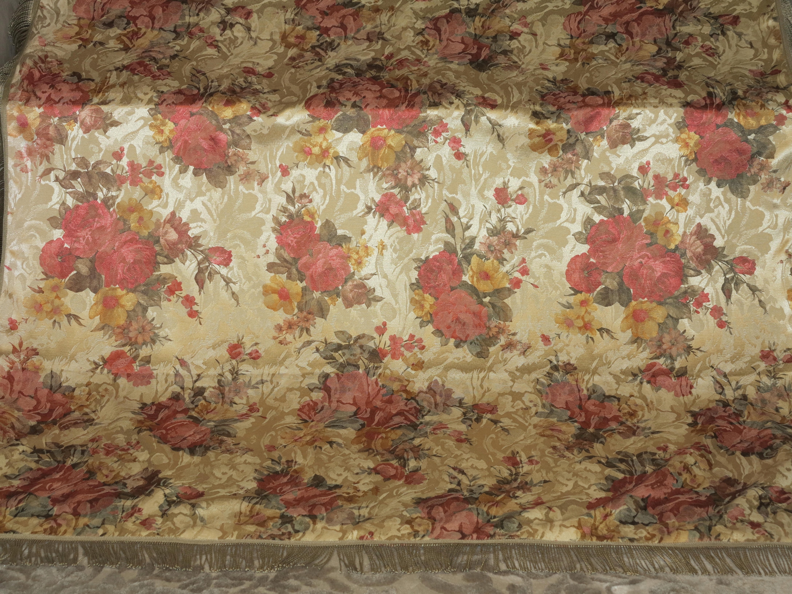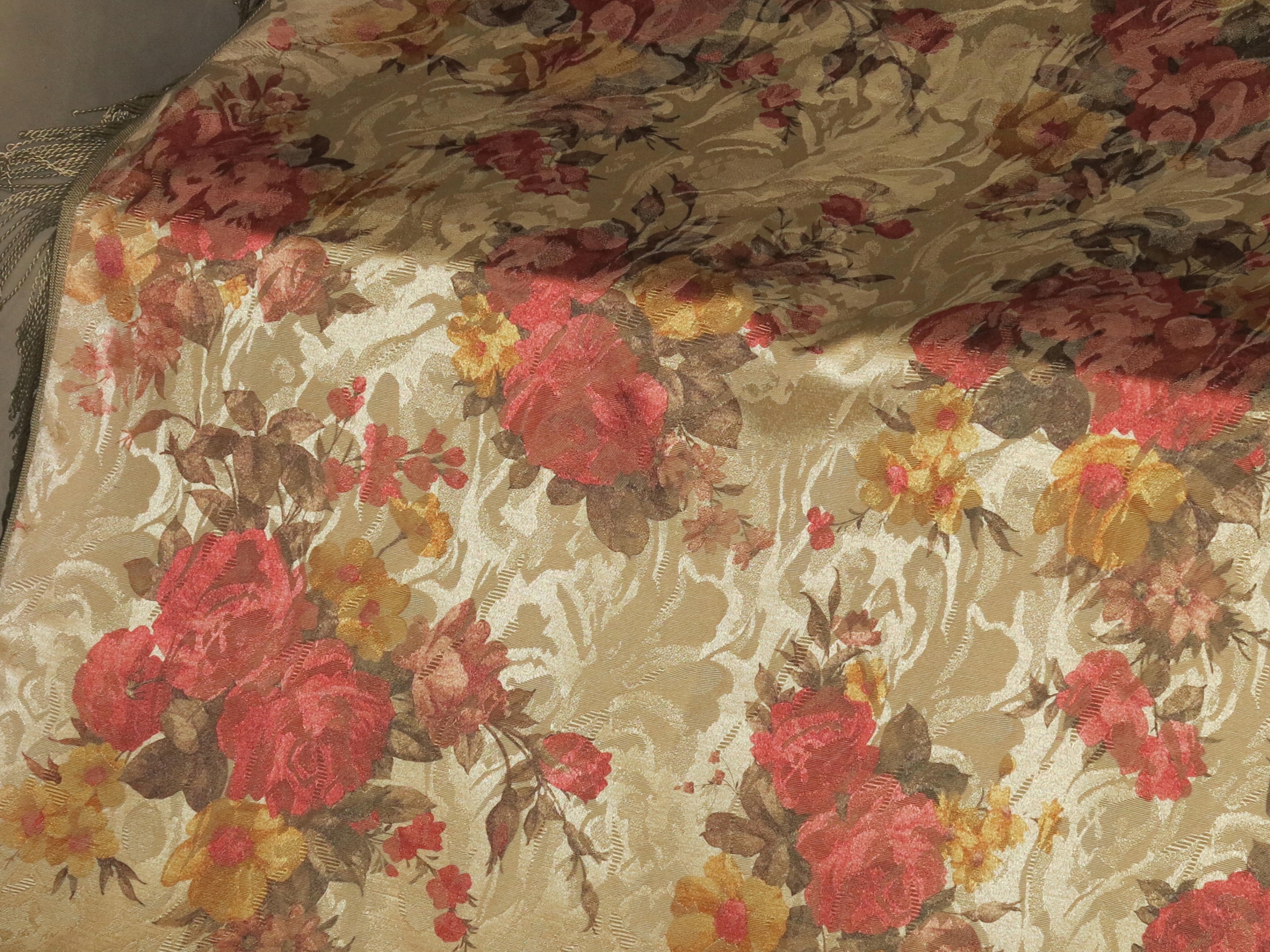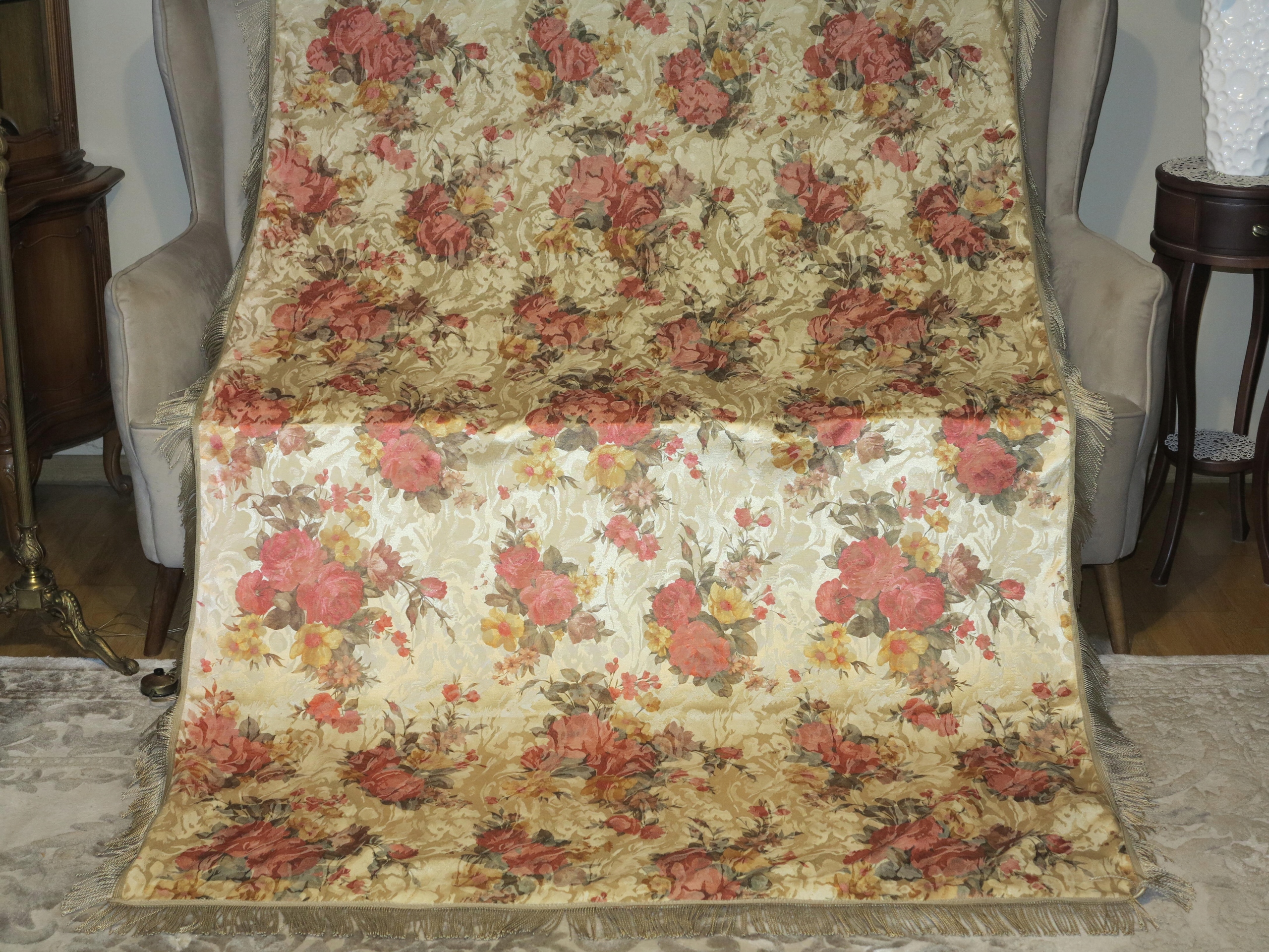 ЧУДОВУ АНГЛІЙСЬКУ СКАТЕРТИНУ З ВЕЛИКИМИ КВІТКОВИМИ БУКЕТАМИ, ОБРОБЛЕНИМИ ДОВГИМИ ЗОЛОТИМИ БАХОМКАМИ. НА ТКАНИНІ Є ДОДАТКОВО НАШТАПОВАНИЙ БЛИСКУЧИЙ МАЛЮНОК. ТКАНИНА ПЕРЕГЛАШНО БАВОВНА ЖАККАР