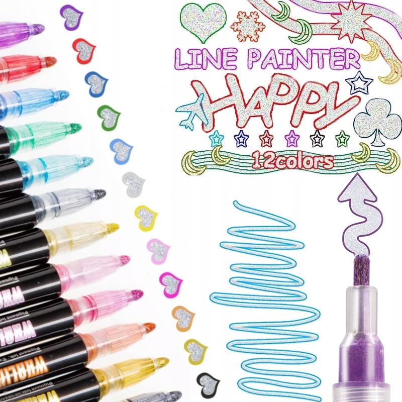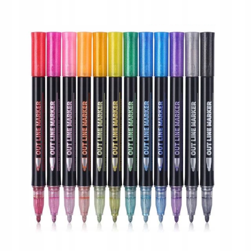 MAGICZNE MAZAKI PISAKI PODWÓJNA LINIA METALICZNE KONTUROWE BROKATOWE 12SZT