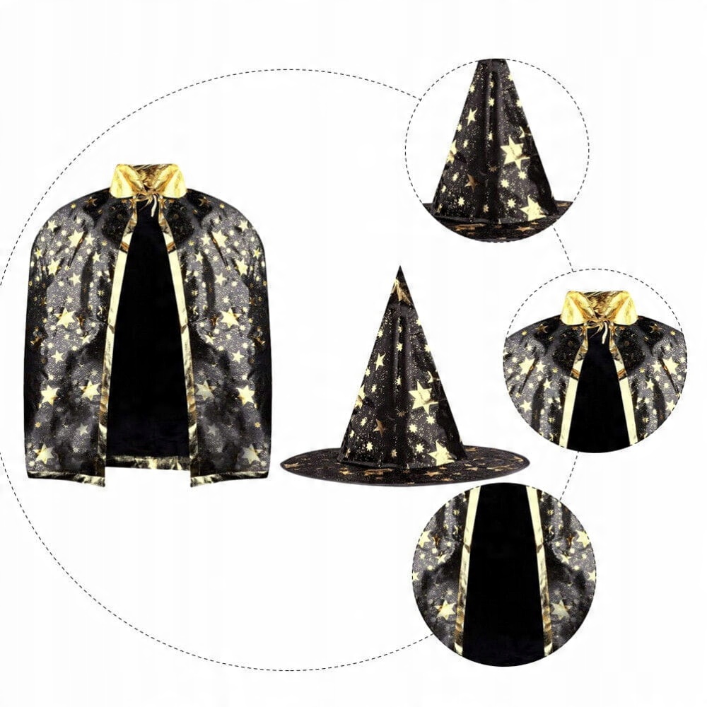 Красива дитяча чарівна накидка, зав'язується під підборіддя. Вся чорна, оздоблена золотою оправою з золотими зірочками. Додатково в комплект входить шапка.
