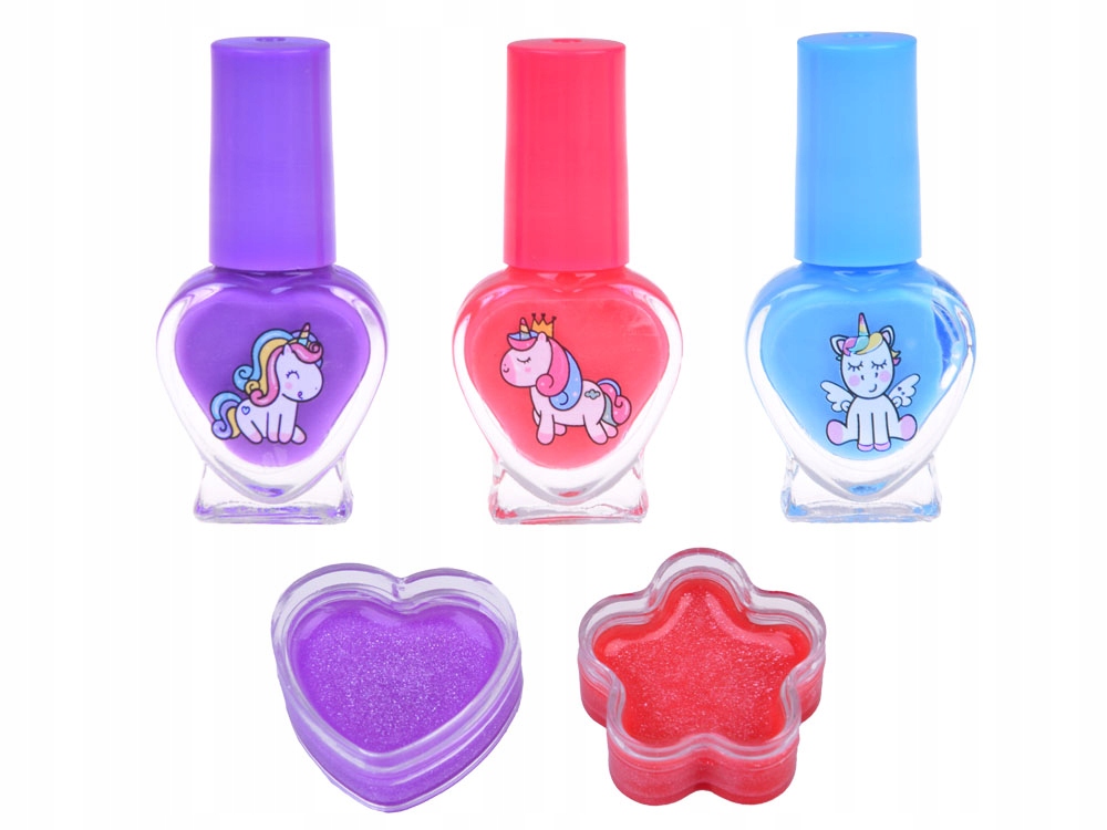 - Багате оснащення: В футлярі багато косметики для макіяжу, наприклад, тіні для повік, блиски для губ, лаки для нігтів, пензлі та аплікатори. Усі товари безпечні для дітей і легко змиваються водою.