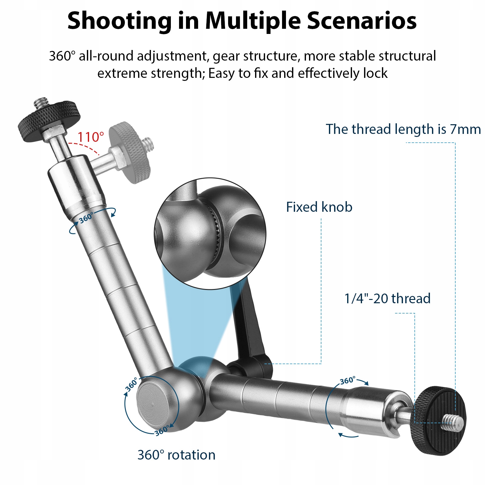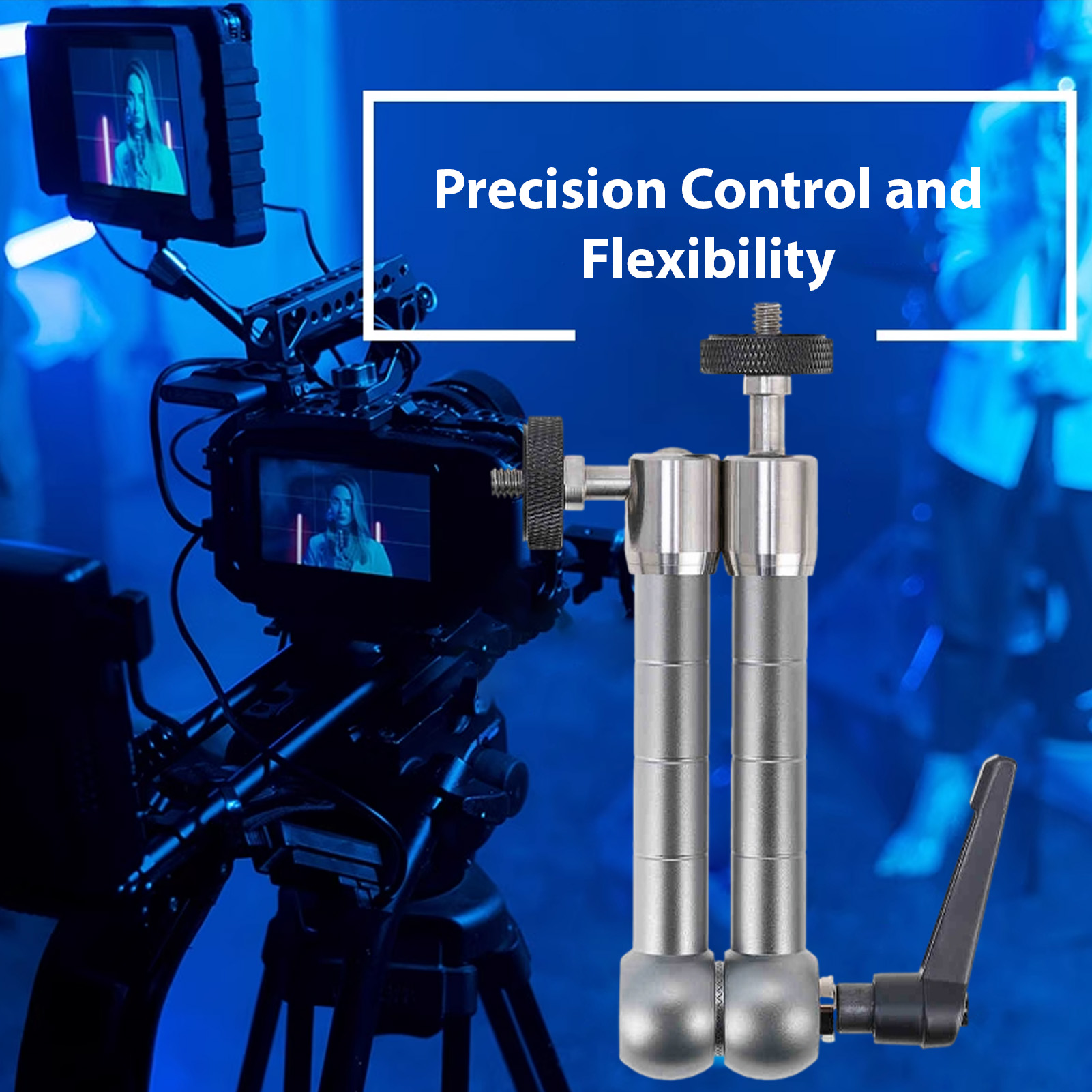 1. Точний контроль і гнучкість. Кронштейн для кріплення плеча камери має інноваційну конструкцію фіксуючої ручки, яка дозволяє легко регулювати відпуск або натяг, дозволяючи досягати повного руху, щоб задовольнити різні потреби зйомки.