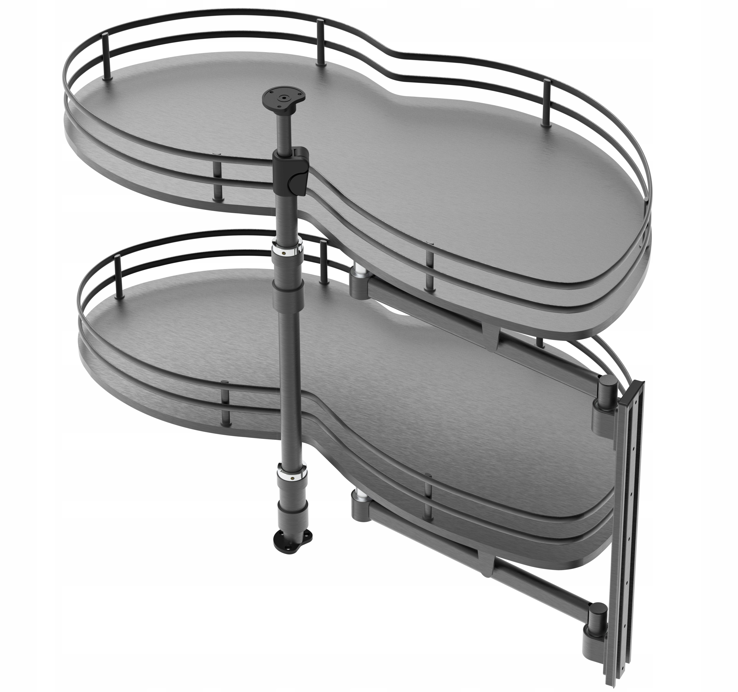 Вантажний кошик типу «нирка» — це система управління простором для нижніх кутових шаф антрацитового кольору. Призначений для шаф з відкидними фасадами. Полиці, які висуваються незалежно одна від одної, значно покращують функціональність і полегшують доступ до продуктів.