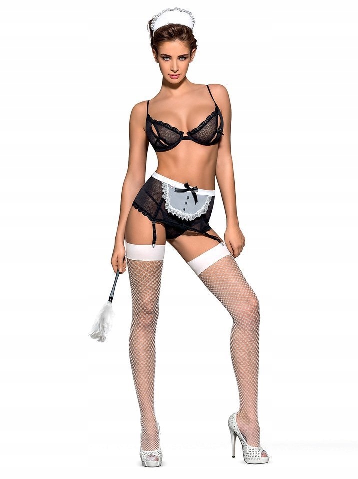 У комплект входить: бюстгальтер, пояс для підв'язок, гладкі чорні стрінги, панчохи та пов'язка.