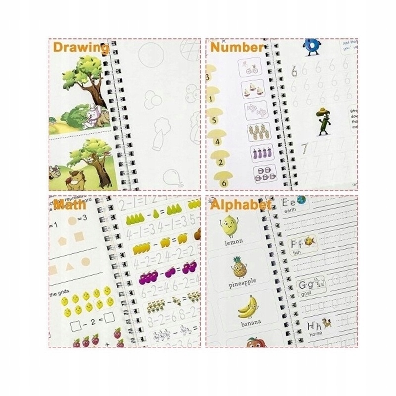 Ноутбук має тривимірні канавки, завдяки яким дитина може навчитися правильно писати. Власник ручки допомагає практикувати здатність тримати ручку, щоб дитина не отримувала чорнила знову.