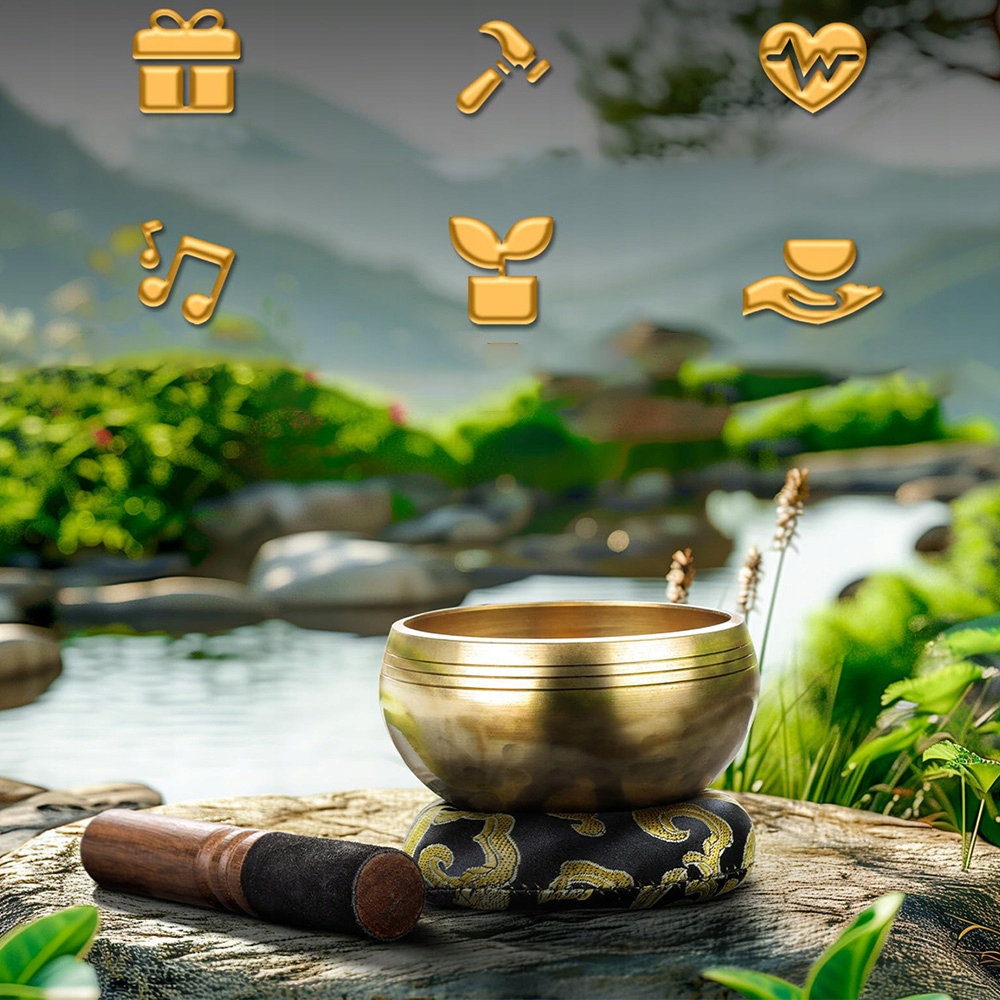 Наша миска для співу медитації має діаметр 8 см. Він містить чашу з медитацією, кільце -семінське кільце у формі кільця і молотка.
