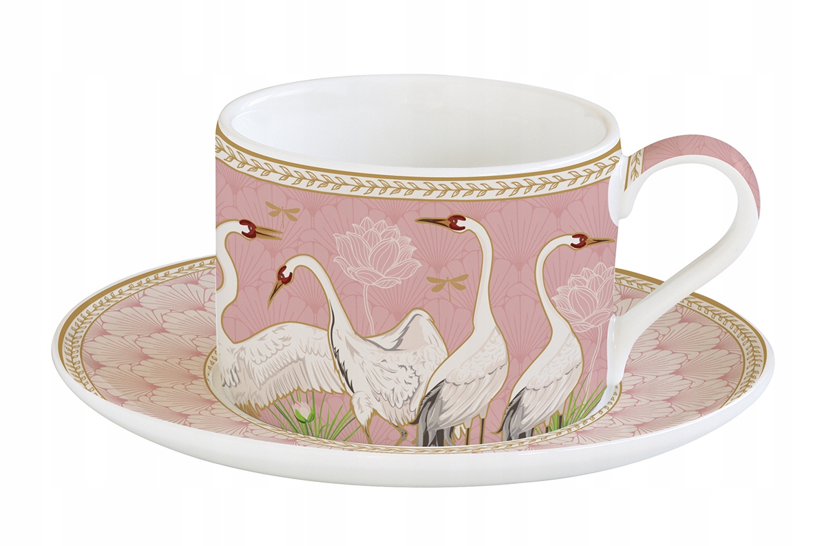 Велика містка чашка з блюдцем. Виготовлена з порцеляни, вона радує модним пастельним малюнком чаплі. Чашка поміщена в елегантну коробку з таким же дизайном. Ідеально підходить як подарунок на багато випадків.