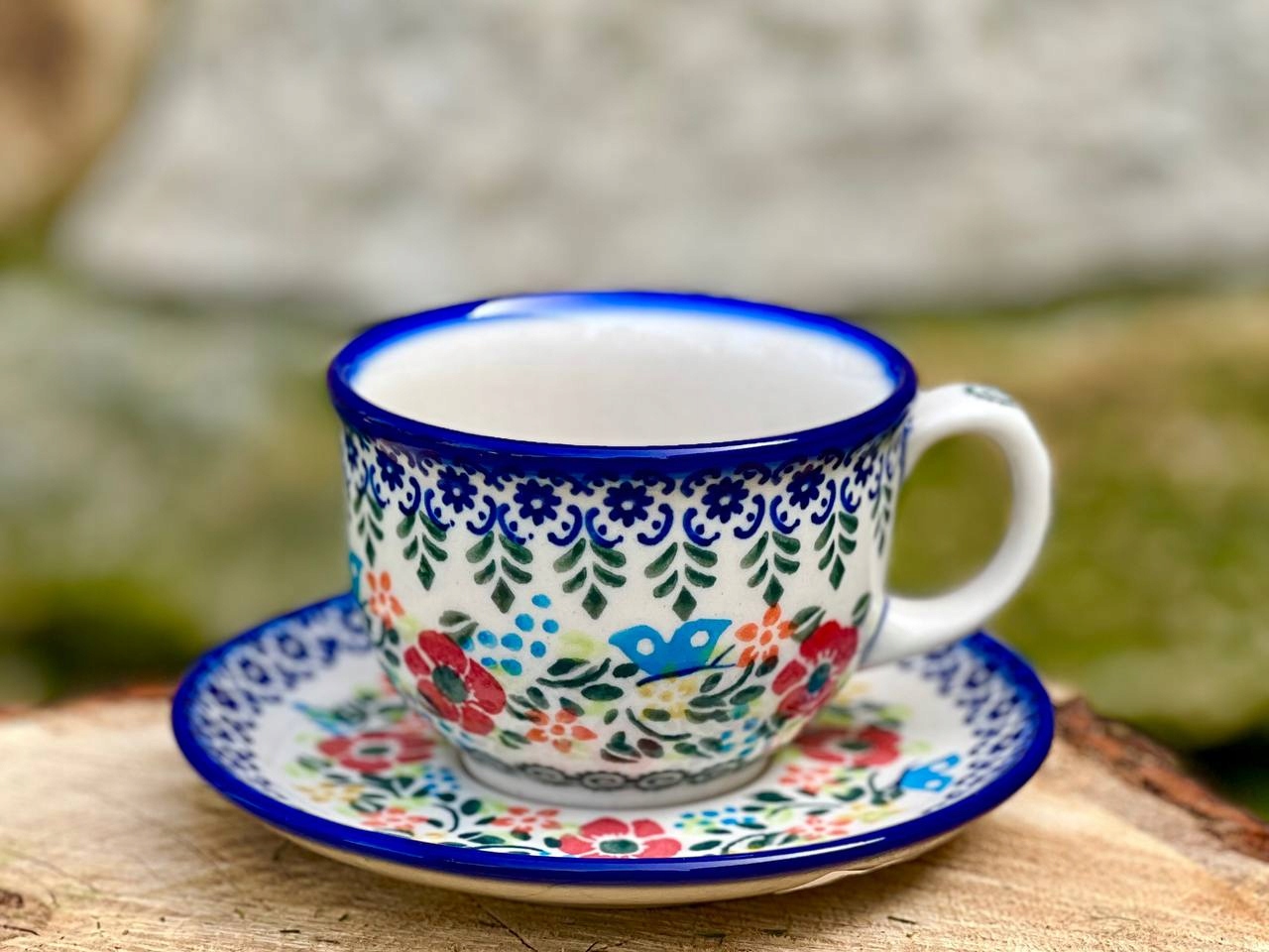 Чашки та блюдця, прикрашені вручну, виготовлені традиційним болеславецьким методом декорування штампами та пензликами.