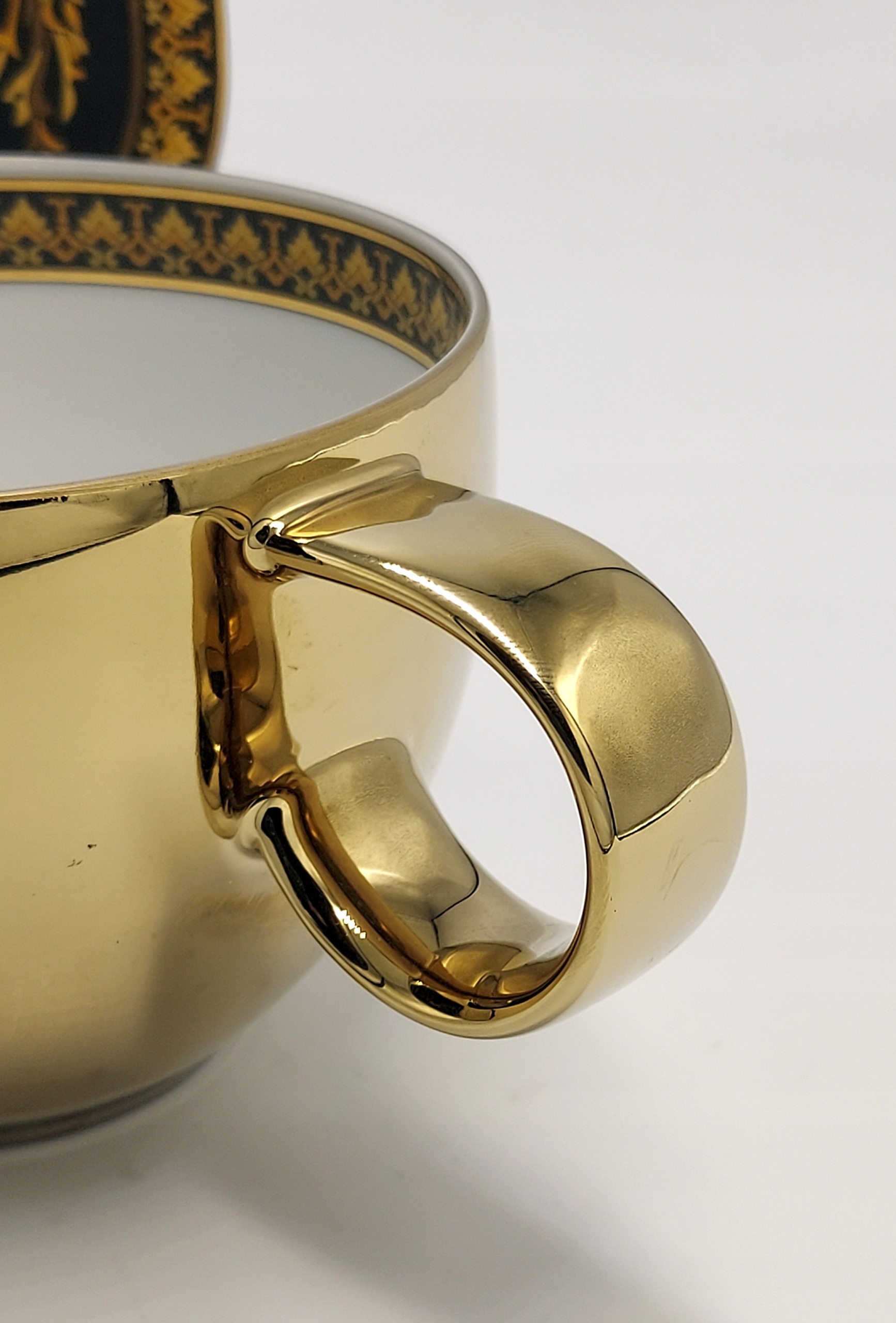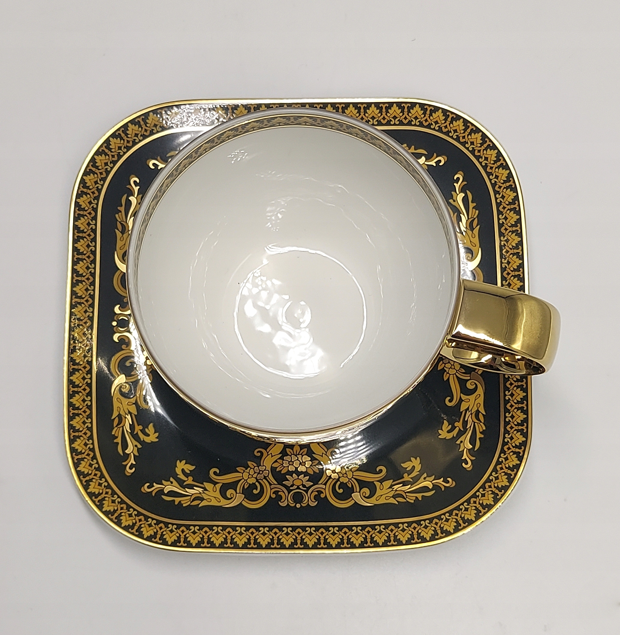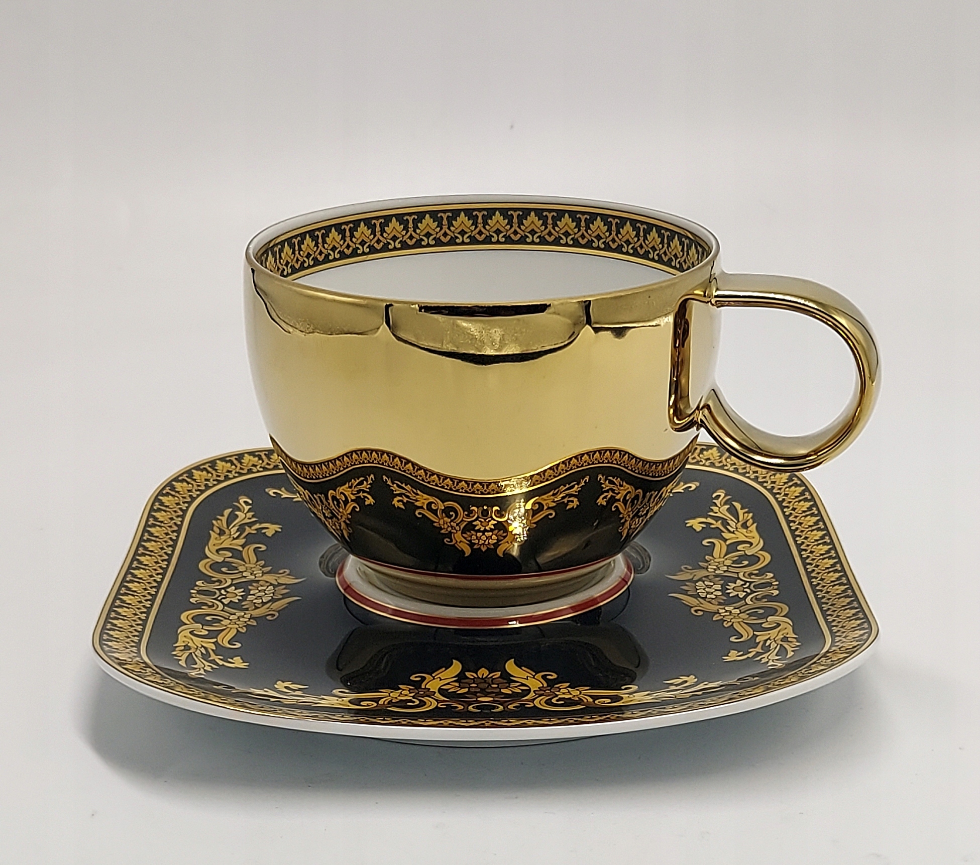 Чашка була виготовлена з найякіснішої порцеляни дуже простої форми та повністю позолочена зовні. Всередині тільки делікатний декор біля наповнювача. Блюдце виконано в квадратній формі, що дуже дизайнерсько виглядає з чашкою. Він оздоблений чорним і візерунчастим золотом. Підпис внизу.