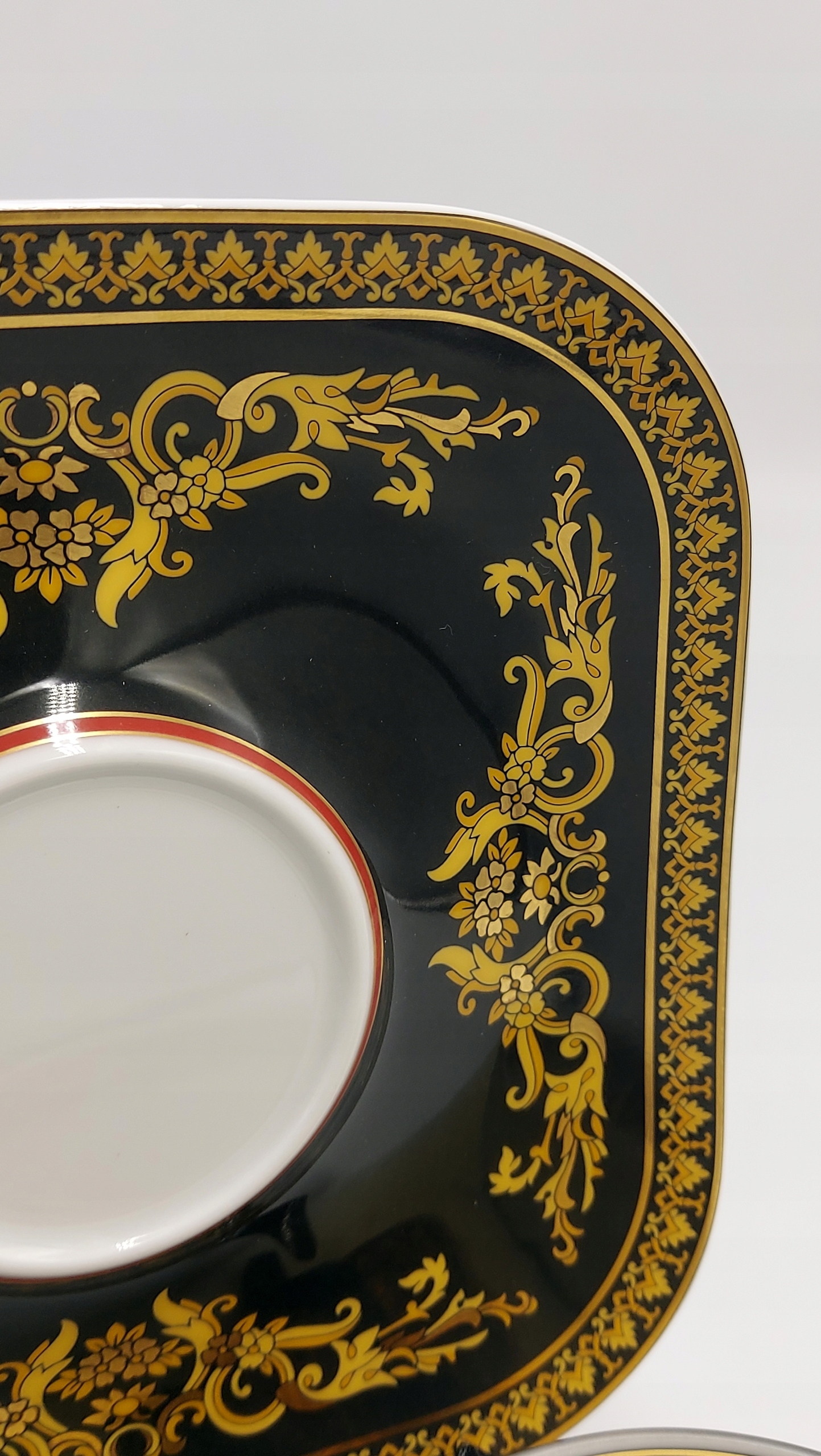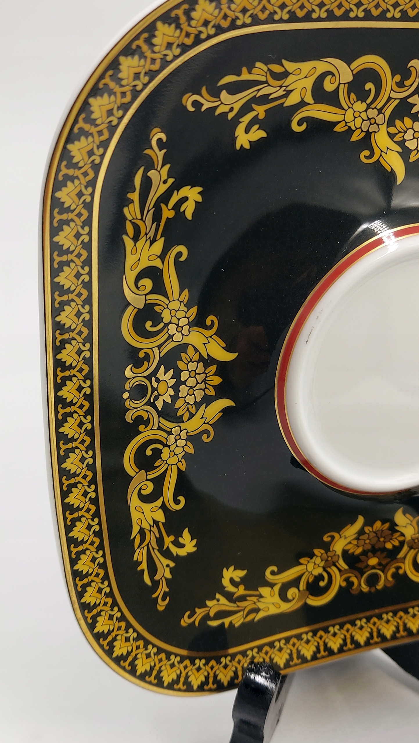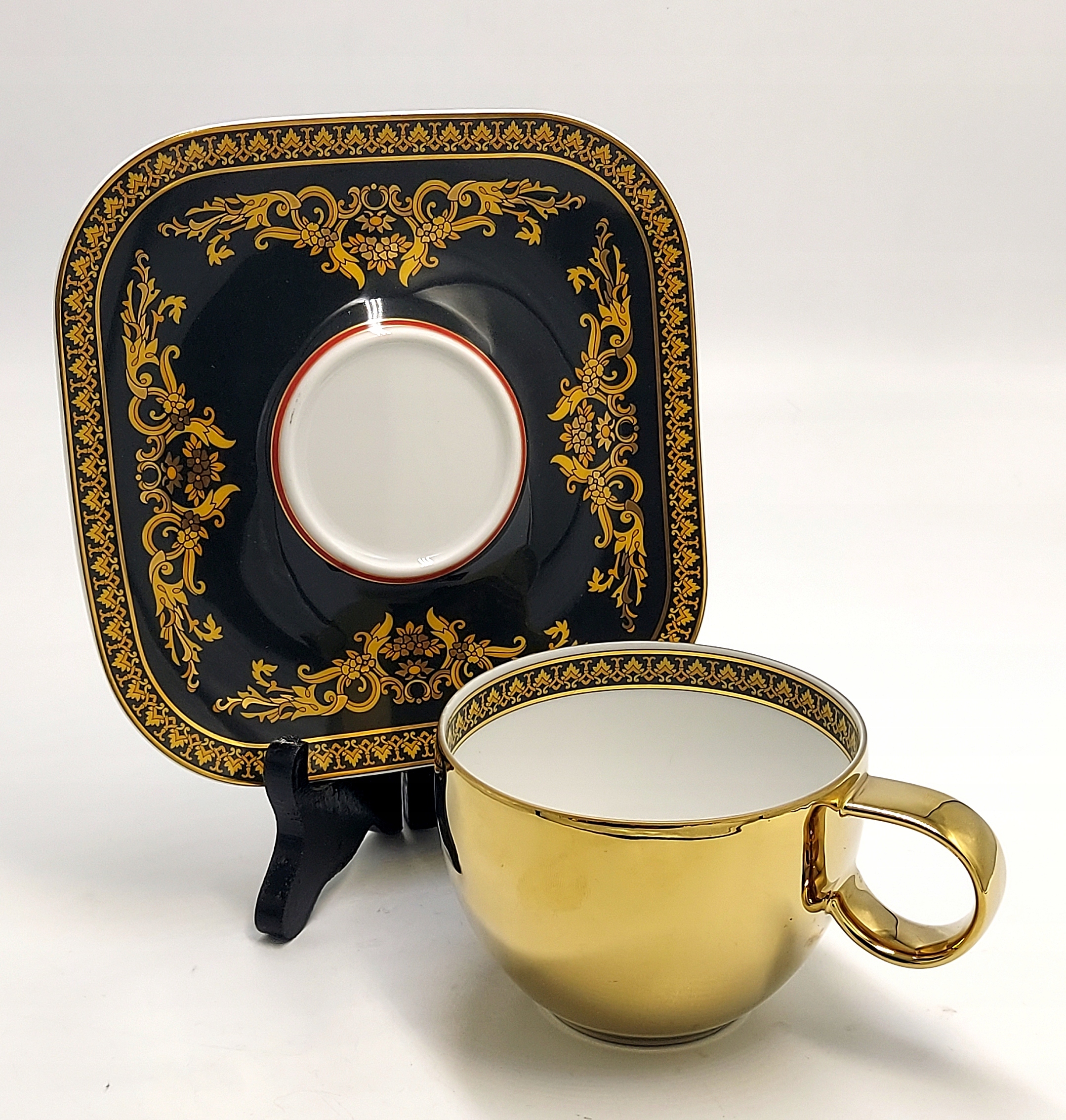 Чашка була виготовлена з найякіснішої порцеляни дуже простої форми та повністю позолочена зовні. Всередині тільки делікатний декор біля наповнювача. Блюдце виконано в квадратній формі, що дуже дизайнерсько виглядає з чашкою. Він оздоблений чорним і візерунчастим золотом. Підпис внизу.
