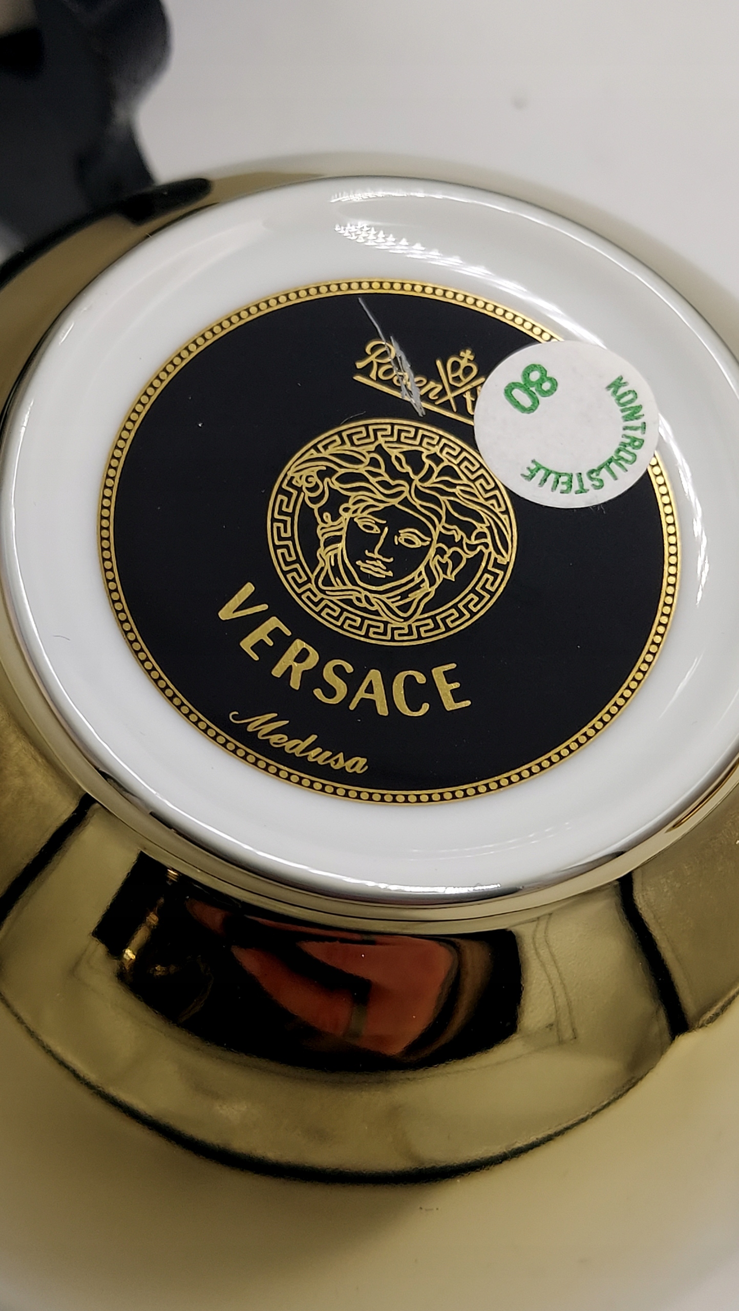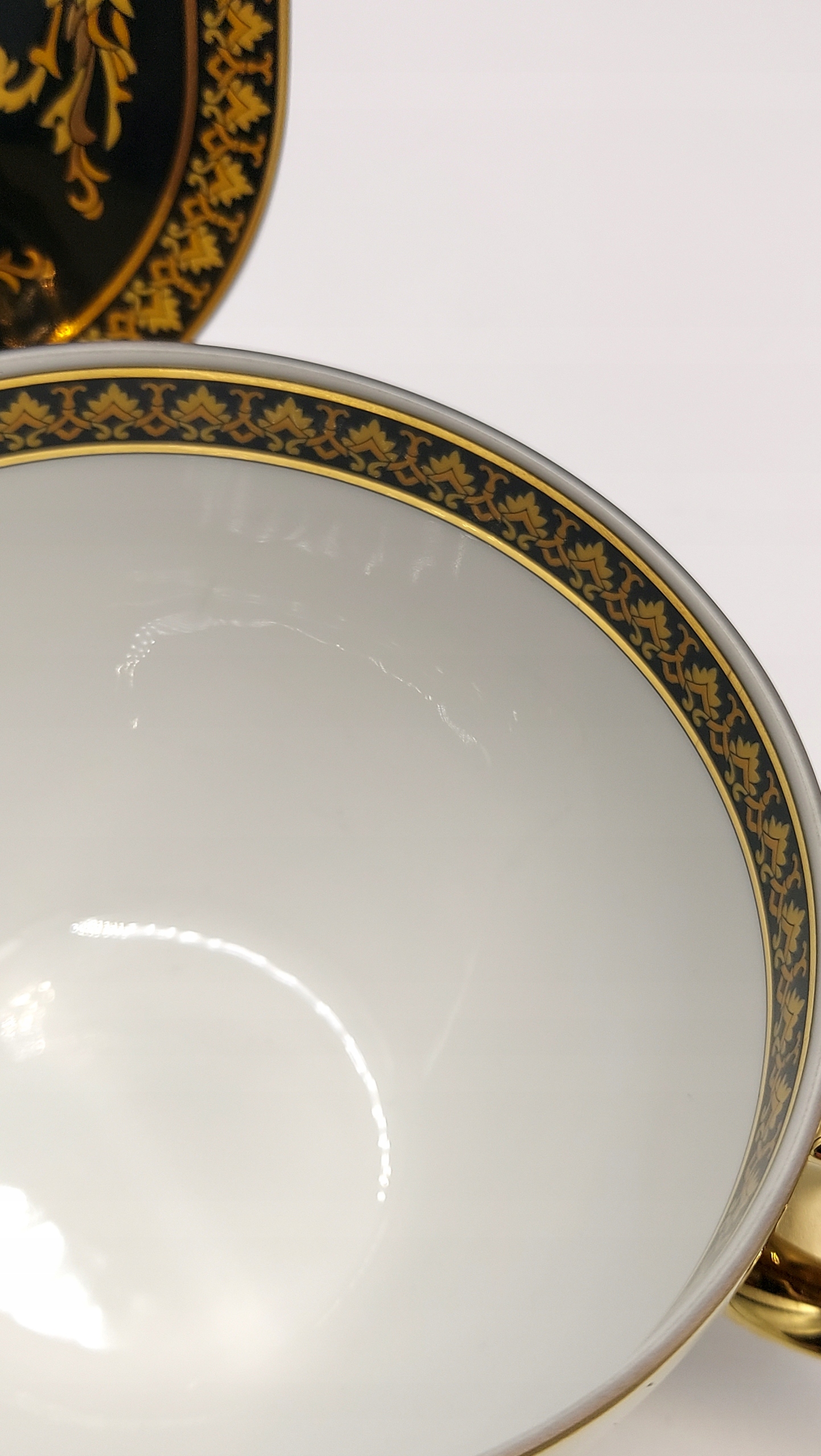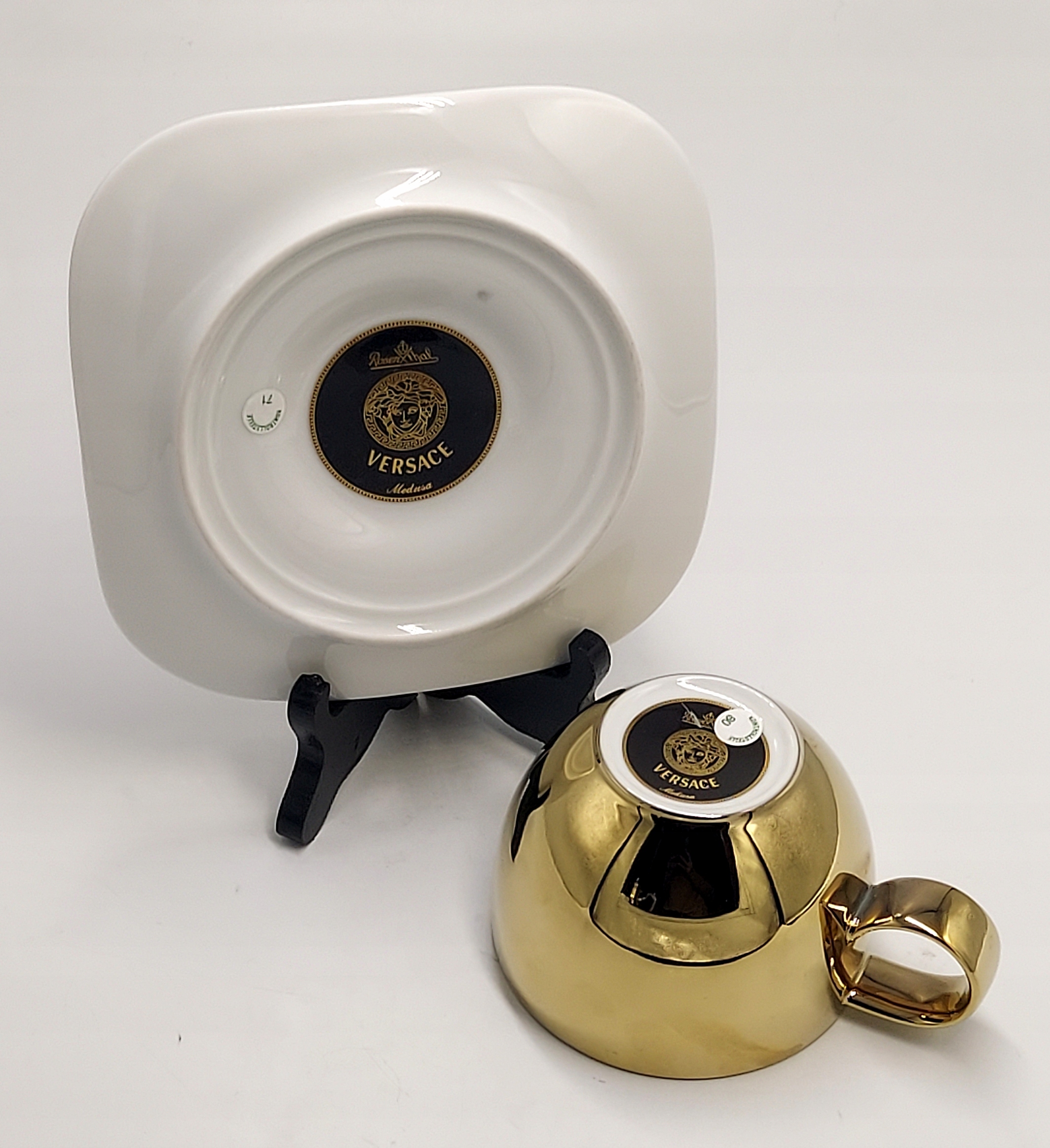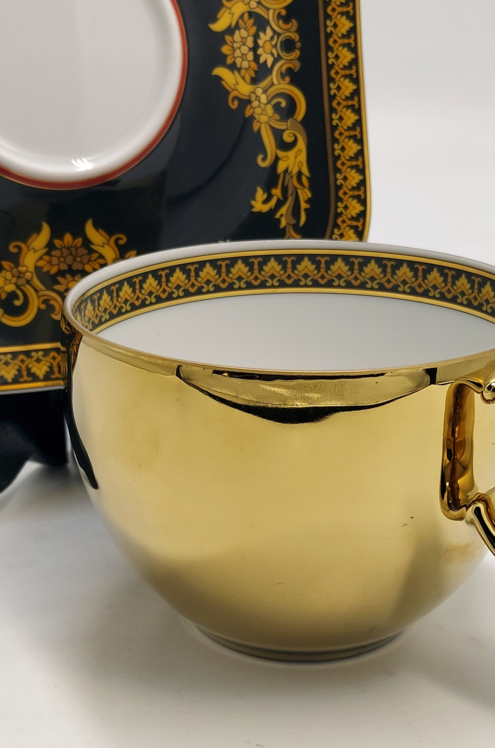 Ми представляємо дуже елегантну чашку з блюдцем, створену завдяки співпраці відомого німецького виробника Rosenthal і Versace (італійська компанія моди класу люкс, заснована Джанні Версаче в 1987 році, пізніше він розширив свій бізнес до аксесуарів, ювелірних виробів і, нарешті, порцеляни )