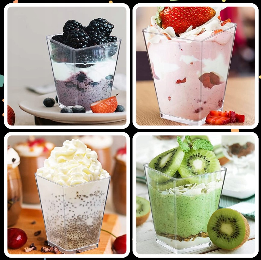 Виготовлені з прозорого пластику. Ідеально підходять для подачі солодких і солоних закусок. Ідеально під час вечірки та святкування, щоб показати їжу в унікальний спосіб. Ми можемо оригінально подати гостям такі десерти, як панакота, тірамісу чи пудинг. Чашки для домашнього та професійного використання.