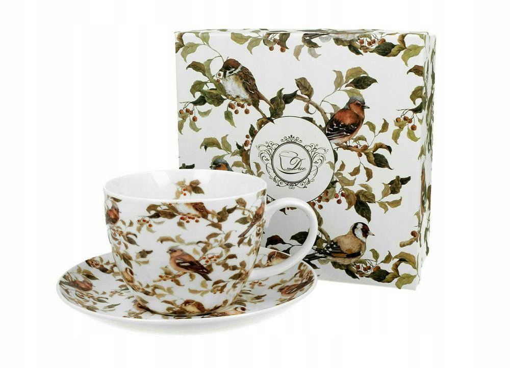 Чашка BIRDS jumbo 470 мл з блюдцем, частина серії Animals, виготовлена з порцеляни New Bone China, що характеризується елегантним і природним кремово-білим кольором з ніжним блиском, а також винятковою довговічністю. Лінійка прикрашена мотивом крихітних пташок на листяних гілочках. Пастельні та теплі кольори надають колекції шарму. Все, що запаковано в декоративну коробку з однаковим мотивом, — ідеальна ідея для оригінального подарунка.