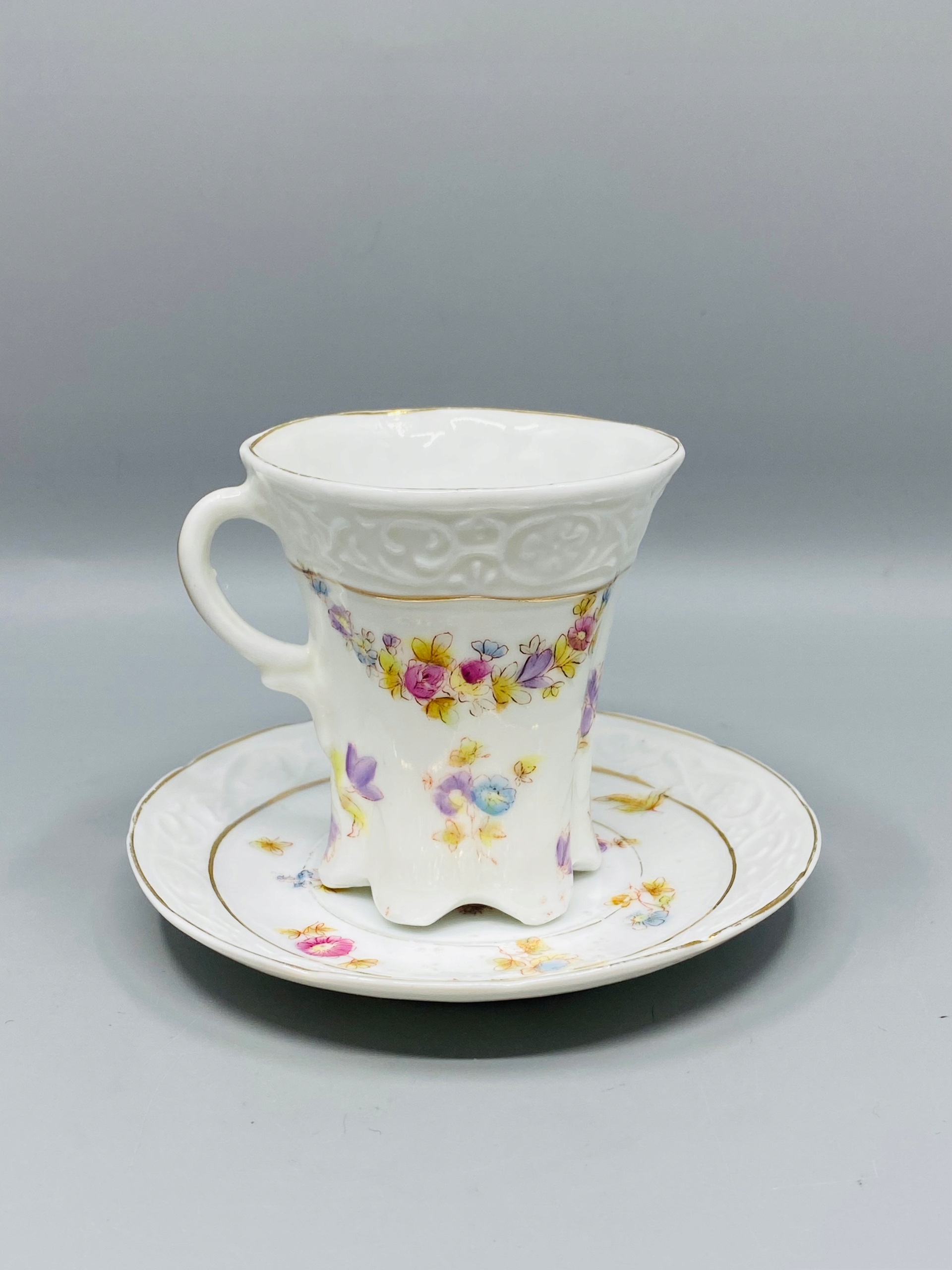 Білий порцелян, прикрашений квітковими мотивами, натисканням та позолотою.