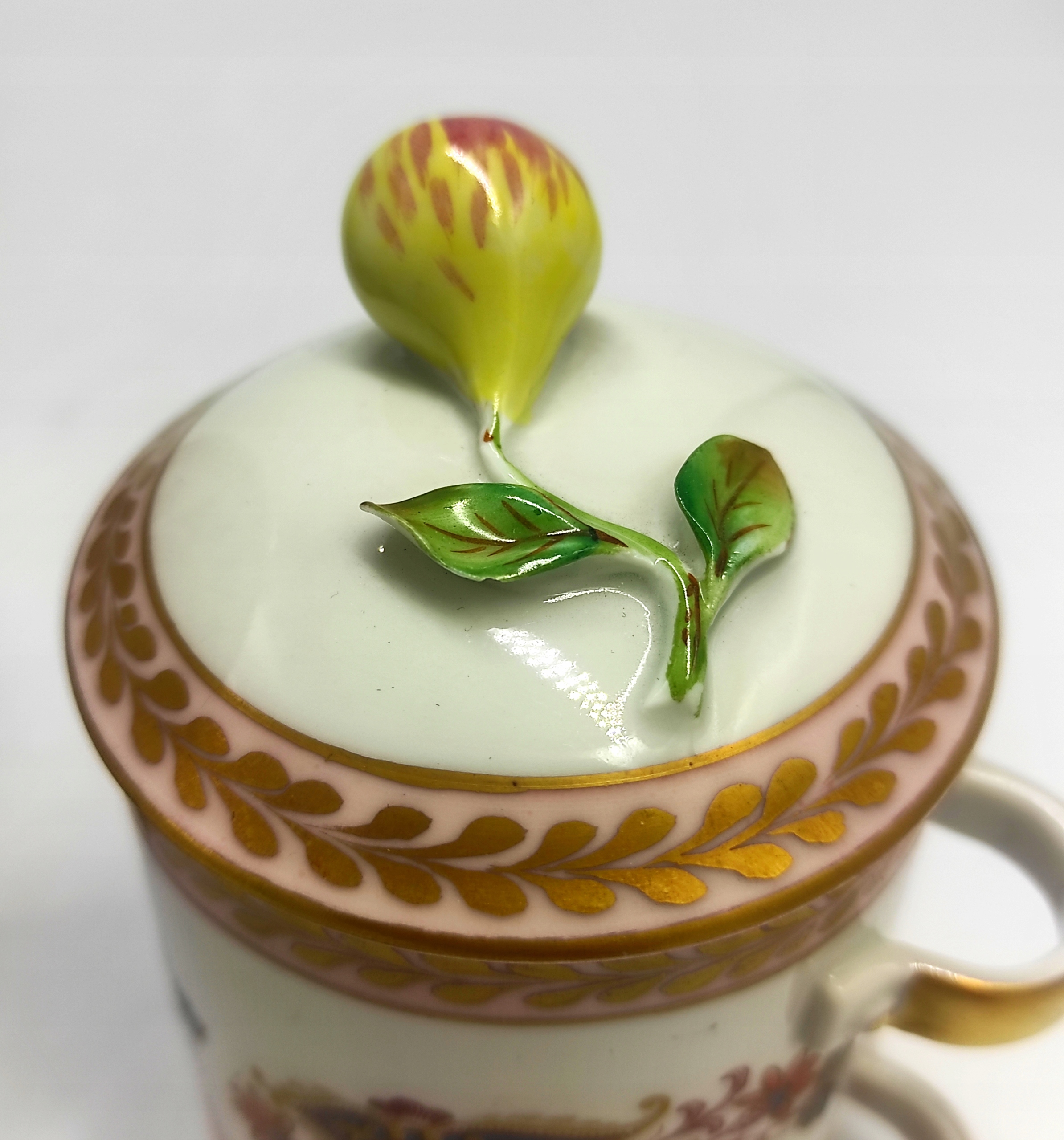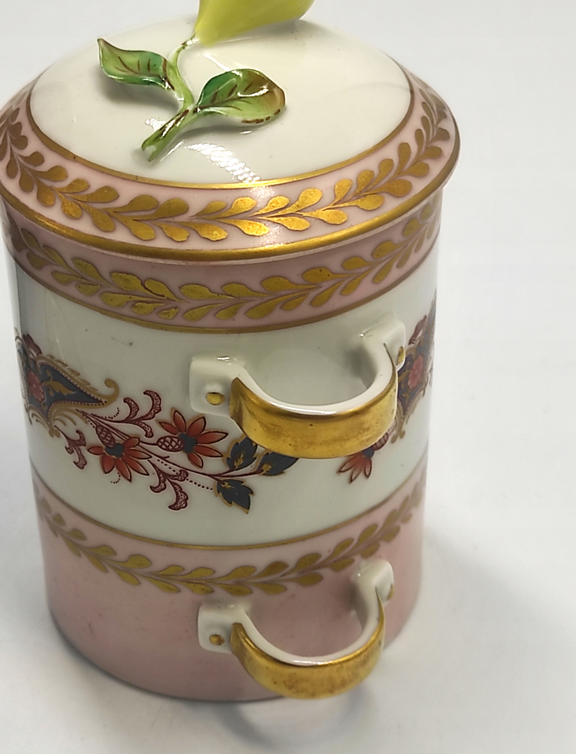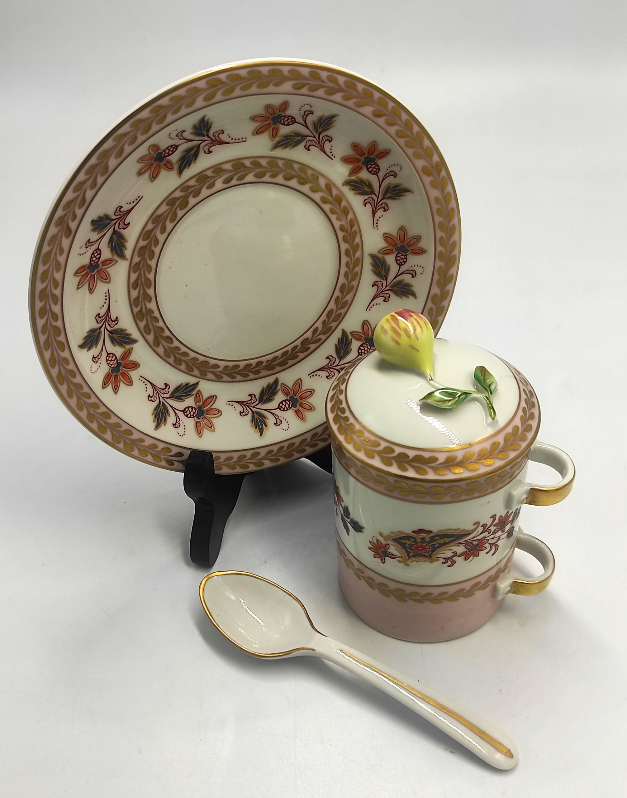 Набір повністю виготовлений з порцеляни найвищої якості і складається з чашки, кришки, блюдця та ложки, яка має дві ручки збоку і може бути там розміщена. Декор включає красиві квіткові візерунки, позолоту та пудровий рожевий колір, який надає чашці неймовірної вишуканості. Крім того, кришка має чудову грушоподібну ручку, яка виглядає дуже цікаво. Ложка також має позолочені елементи. Це не тільки дуже привабливий предмет, але і функціональний. Все ідеально поєднується. Ідеально підходить як подарунок або як прикраса сайту.