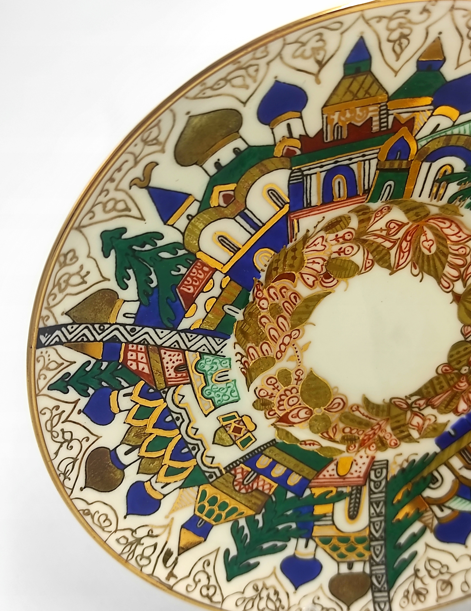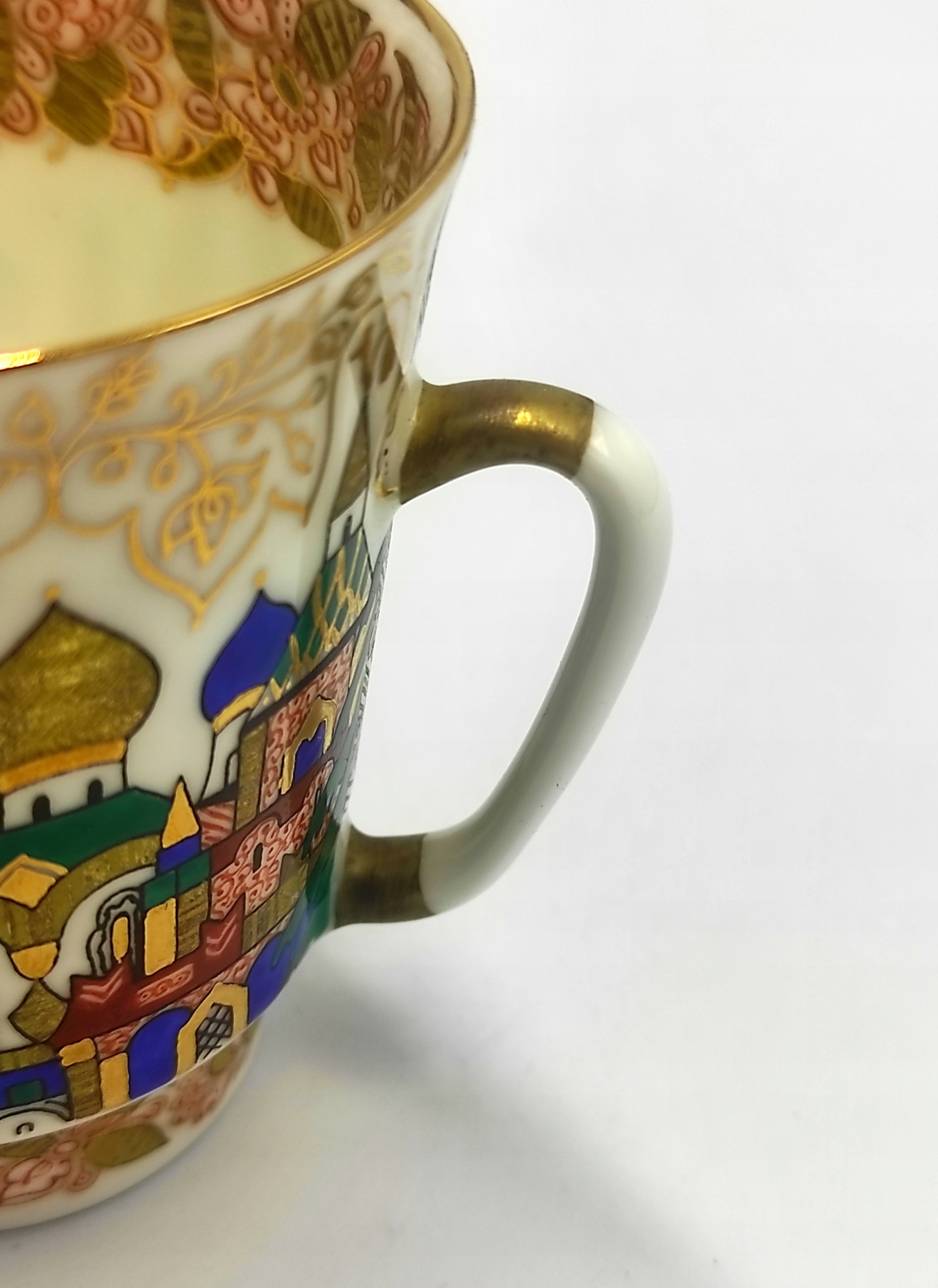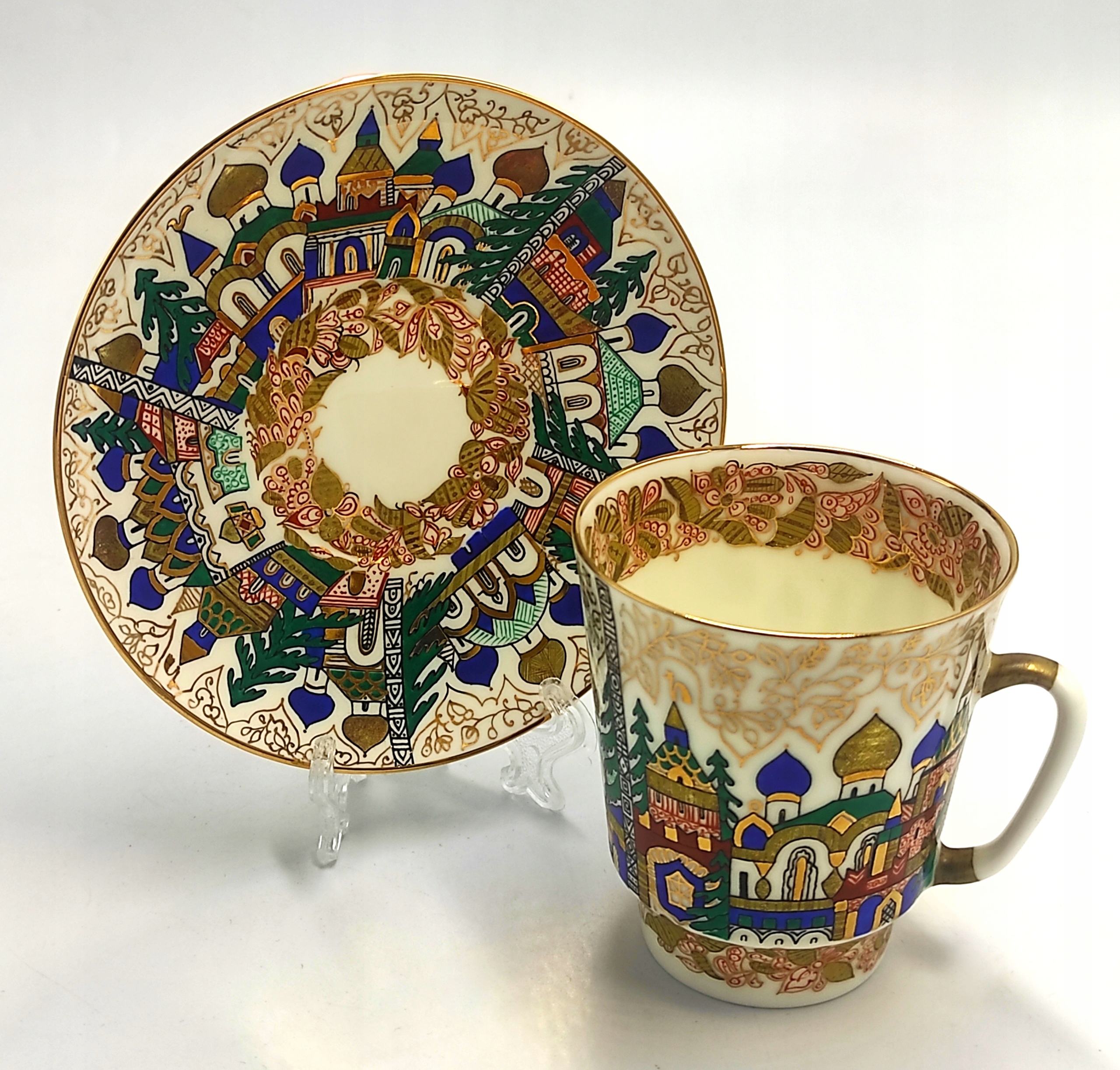 Він був виготовлений із кістяного фарфору найвищої якості, який пропонує ця чудова мануфактура. Декор цієї чашки, безсумнівно, чудовий. Розписана вручну, вона представляє архітектуру Стародавньої Русі в красивих яскравих кольорах. Сюди чудово поєднується темно-зелений, темно-синій і коричневий з багатьма доповненнями позолоти. Виглядає дуже багато і приголомшливо. Чашка і блюдце підписані знизу знаком Made In Russia, який використовувався в 1992-2001 роках. На звороті також є напис, що це давньоруська архітектура. Він стане чудовою прикрасою для вітрини, але також стане чудовим подарунком для тих, хто любить російський фарфор.