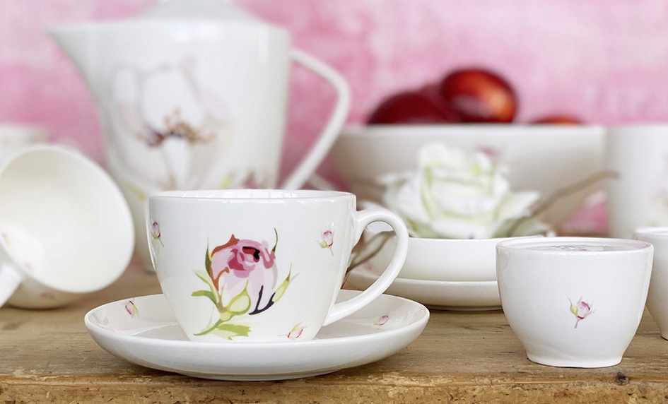 чашка з блюдцею - для кави, порцелянового матеріалу, ємність 220 мл, біла з прикрасою троянд, придатна для миття в посудомийній машині, від чеської марки Inspire ... порцеляни з чеською душею.