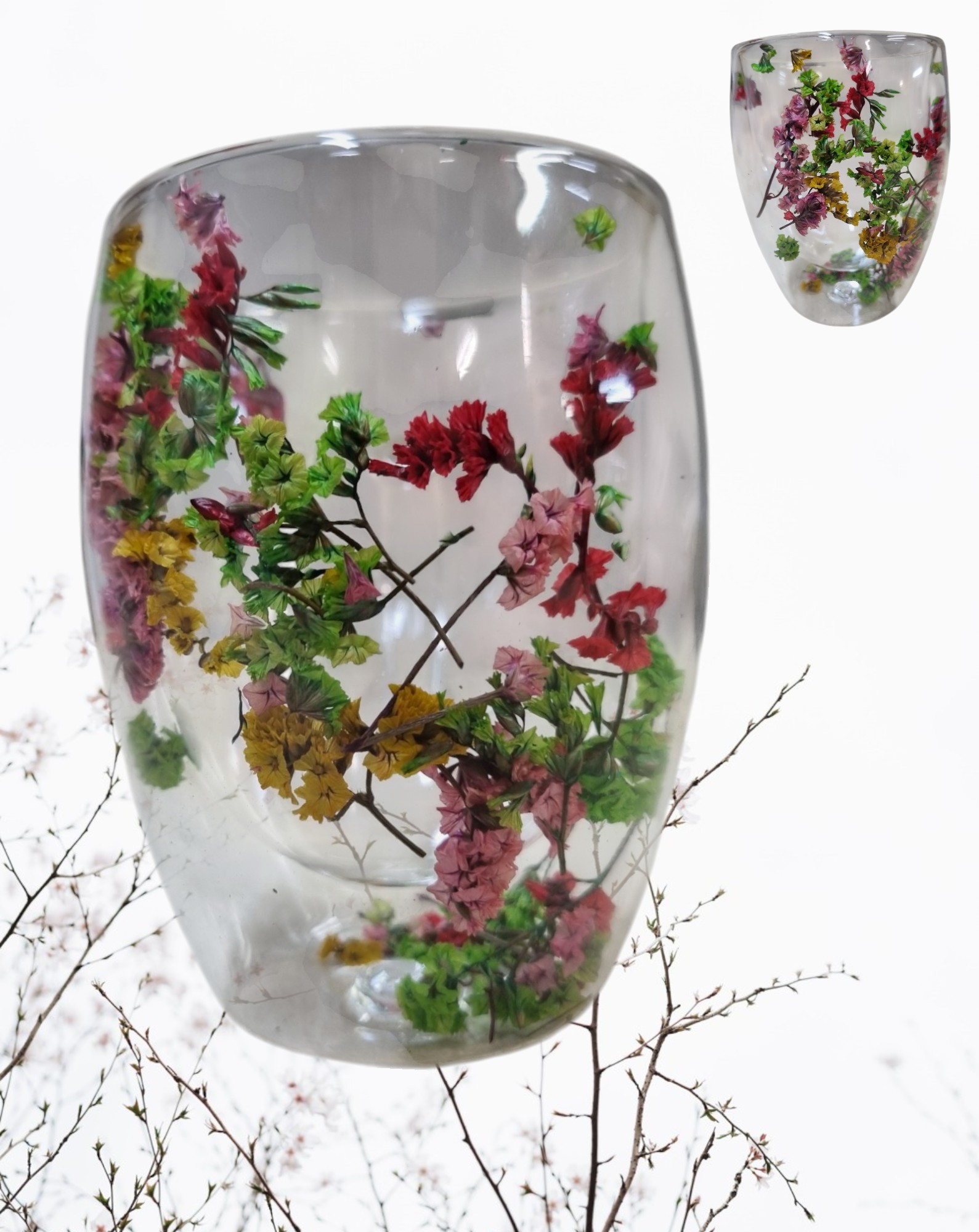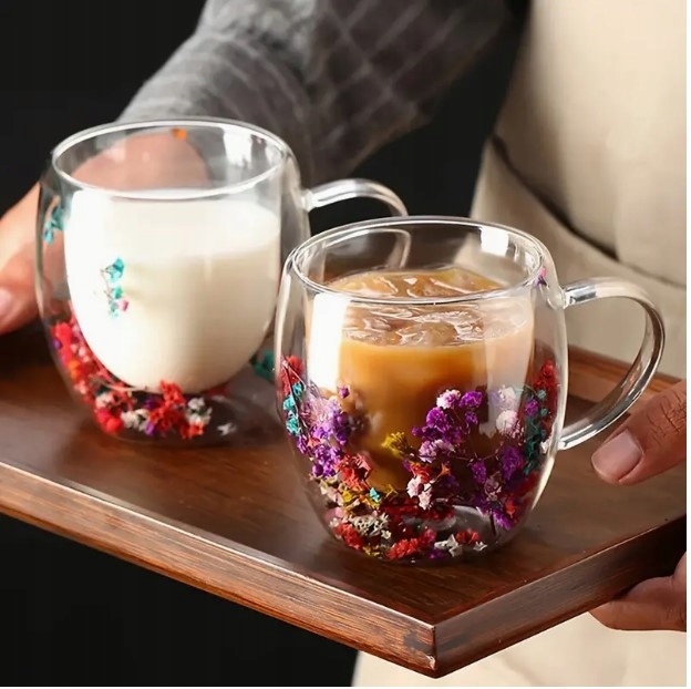 Елегантна та сучасна чашка кави з подвійними стінами наповнена барвистими висушеними квітами, що надає йому унікального характеру. Високоякісне боросилічне скло підходить для подачі як гарячих, так і холодних напоїв. Однак його ізоляція подвійної сталі підтримує не тільки ідеальну температуру напою, але й захищає руки від гарячого напою.