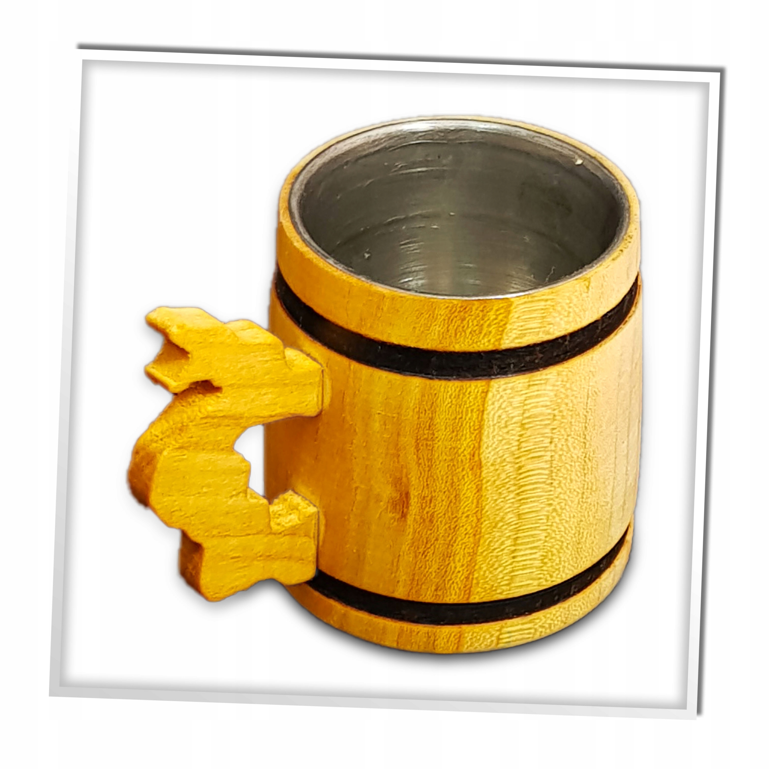 Виріб у сільському дизайні нагадує бочку, кухоль з ручкою неодмінно приверне увагу гостей. Внутрішня частина має сталеву вставку, безпечну у використанні та захищає деревину від пошкоджень, викликаних рідинами.