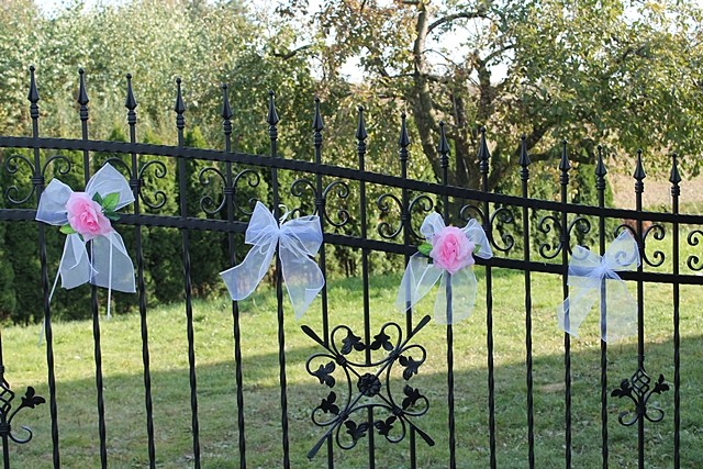 Банти виготовлені з білого шифону, прикрашені великою трояндою обраного кольору та листям.