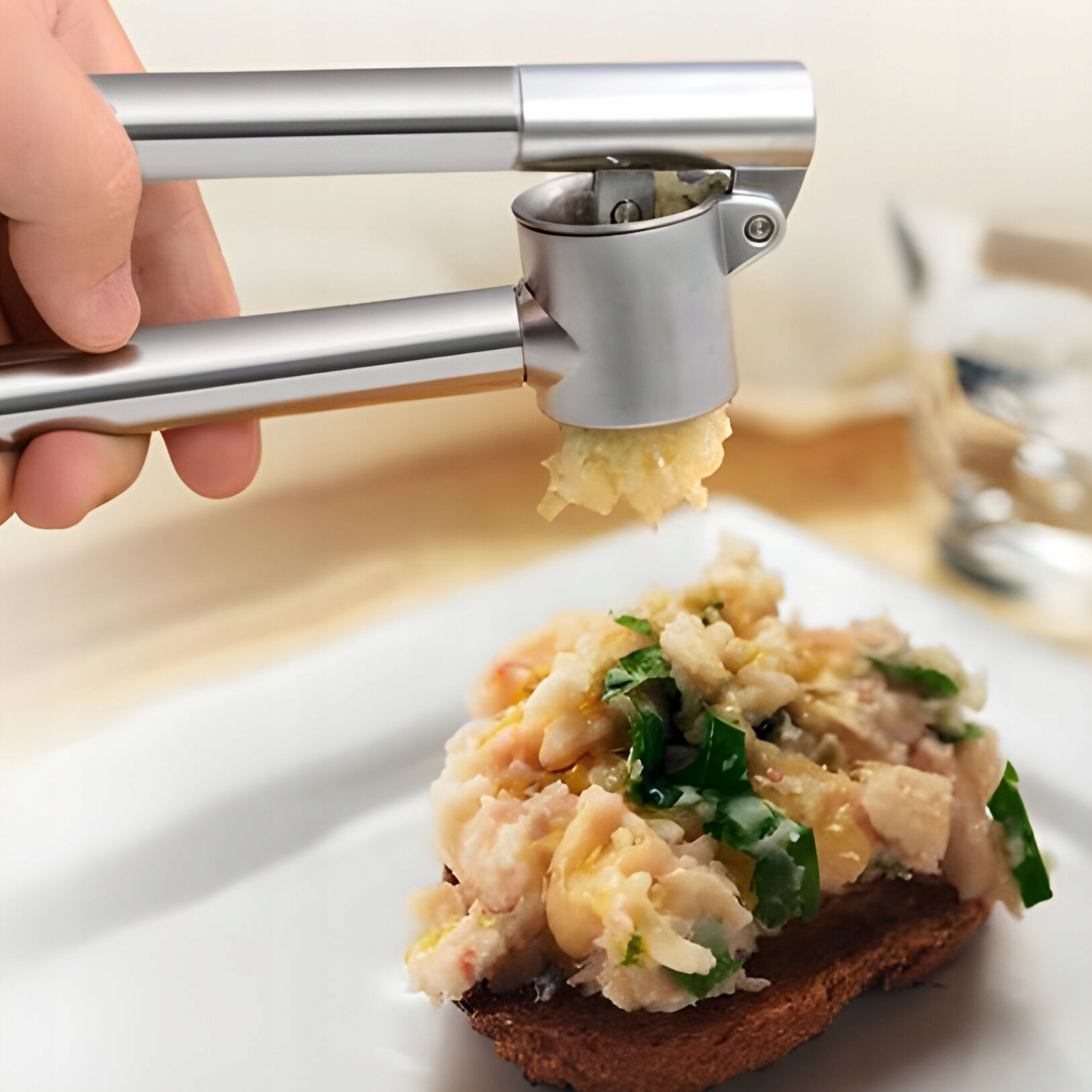 Прес для часнику, окрім стандартної мети подрібнення часнику, можна також використовувати для інших інгредієнтів. Можливість використовувати його для різноманітних продуктів, таких як імбир, горіхи, насіння, коріандр, кмин та багато інших спецій робить його безцінним пристроєм на кухні. Завдяки цьому ви можете обробляти різні продукти за допомогою однієї соковижималки.
