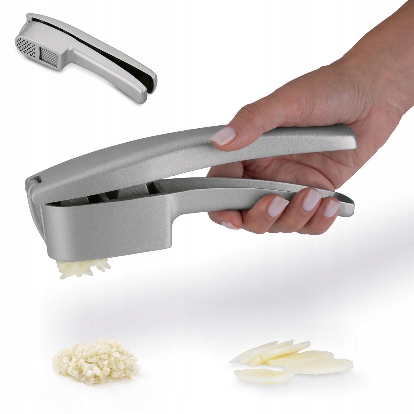 часник Tadar Double - це практичний і твердий. Він був зроблений з алюмінію. За допомогою його допомоги ви добре доповните набір аксесуарів для приготування їжі. Ви будете використовувати його, коли вам потрібно додати пресований часник в рецепт. Ви також будете використовувати продукт для розрізання зубчиків часнику на шматочки (наприклад, для огірків у банках). Завдяки цьому ви щодня вдосконалите свої улюблені страви. Як? Ви розчавлюєте і різаєте часник навіть одночасно. До моделі прикріплений спеціальний очищувач. Це допоможе вам у ретельному догляді за отворами часникового преса. Ви будете мити представлений нарізаний.