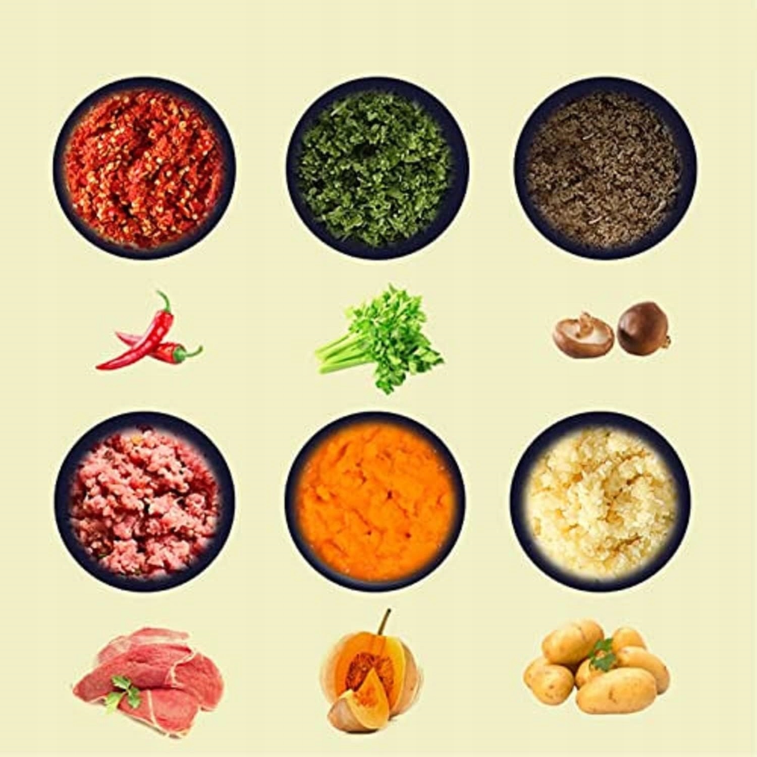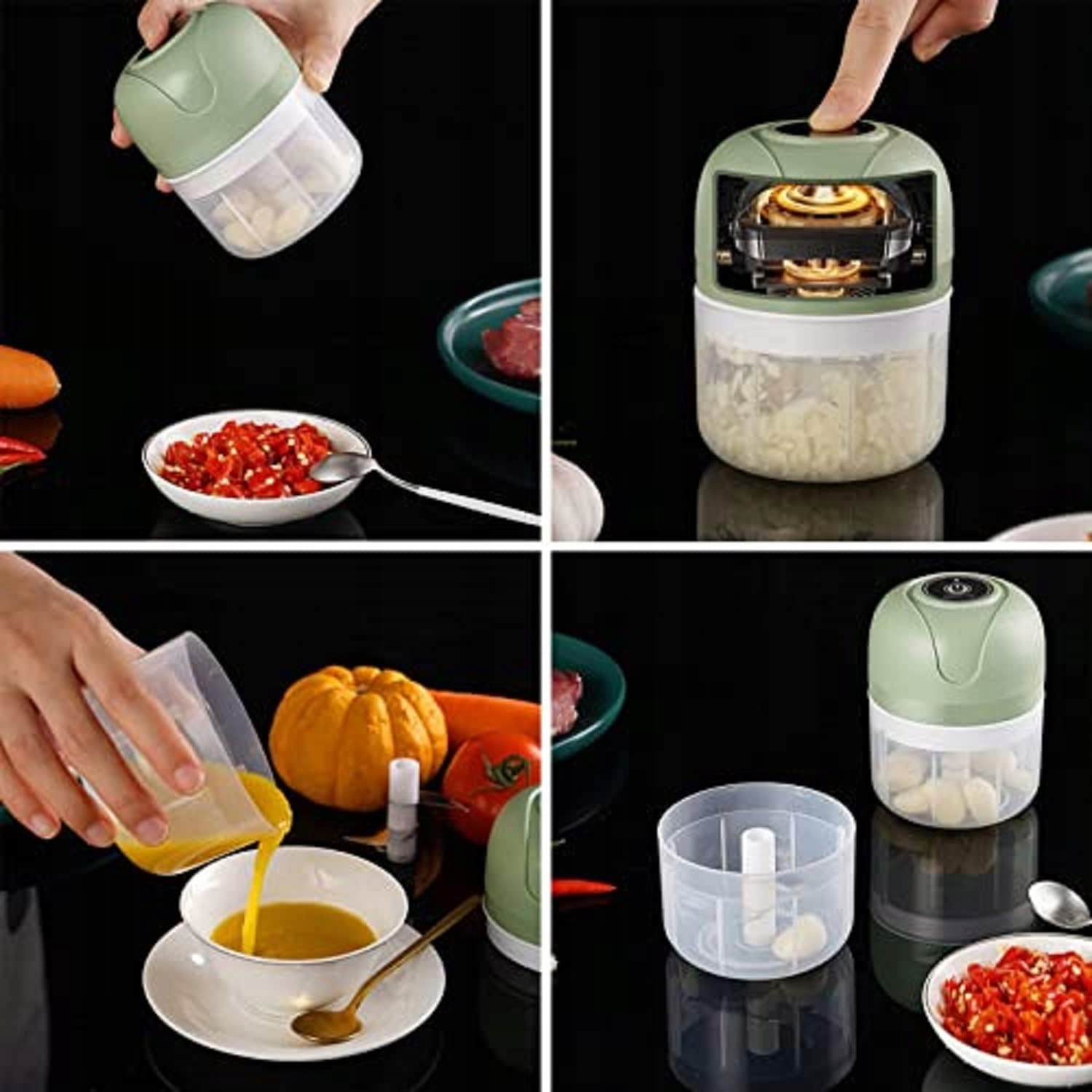 Міні-подрібнювач оснащено чашею з харчового пластику та лезом із нержавіючої сталі 304. Використовується запобіжник - пристрій не запускається, якщо кришка не закрита належним чином. Це забезпечує повну безпеку під час використання.