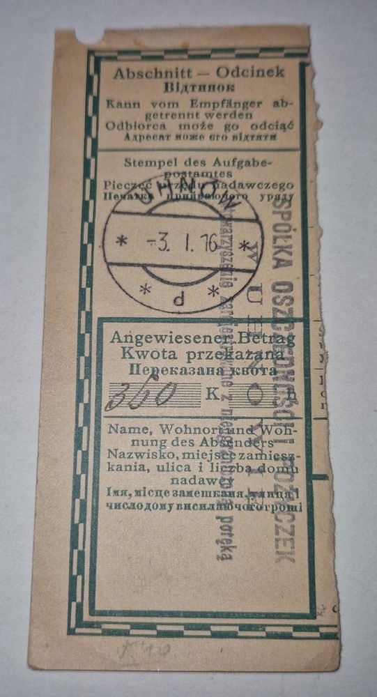 Частина поштового переказу з Угнова, 3 січня 1916 року
