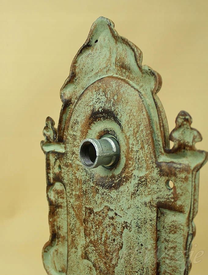 Чавунний підвісний вилив (раковина) з матово-зеленим краном з потертостями.