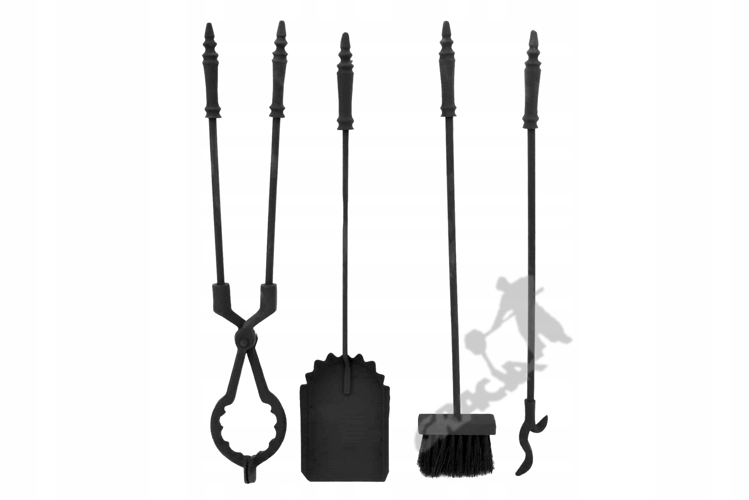 Повне камінне обладнання - інструменти зі сталевих прутів: щітка, кочерга / чавунний гачок і чавунні щипці, а також естетичний і великий совок / з сталевого листа.