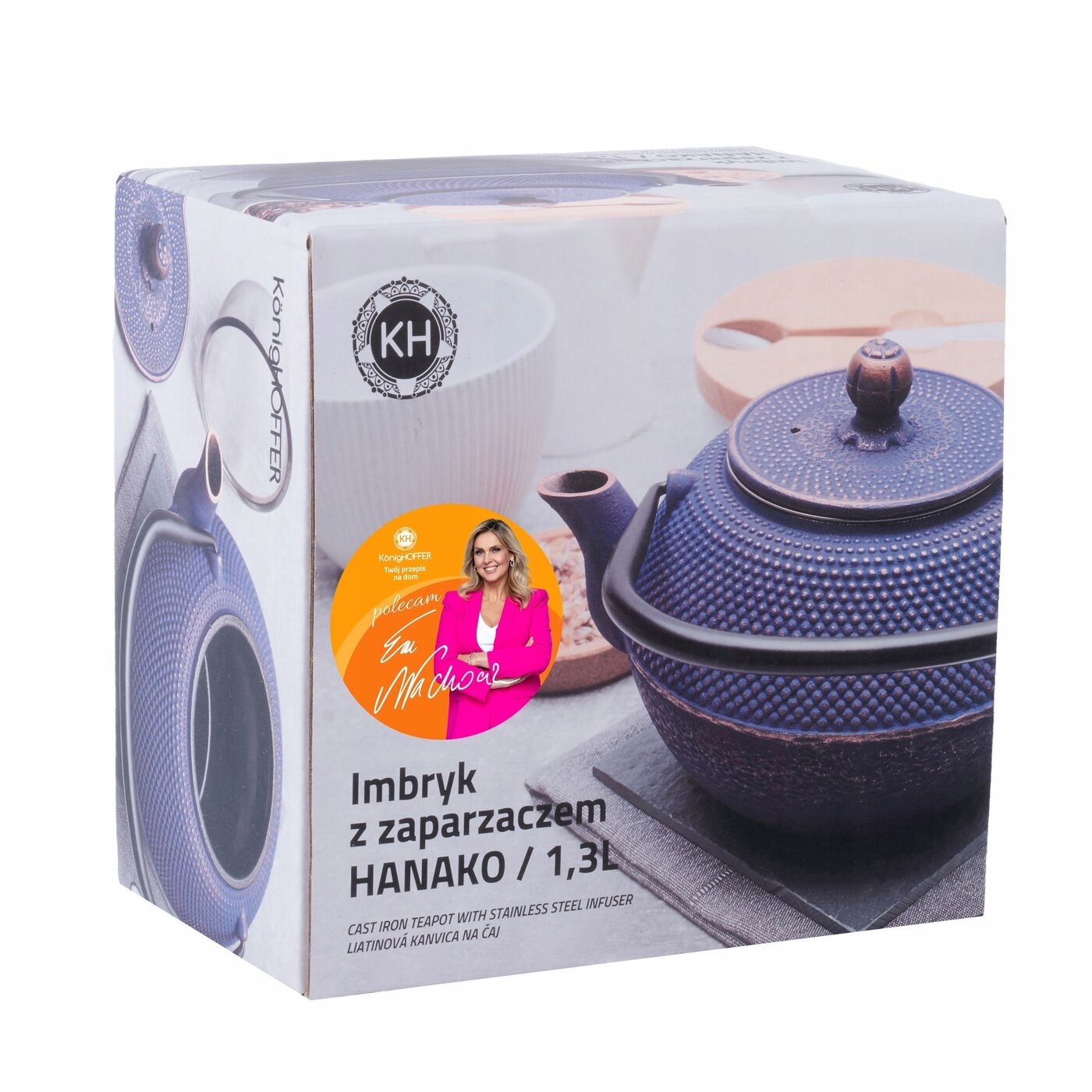 Темно-синій чайник з заваркою Konighoffer Hanako 1,2 л виготовлений з чавуну. У комплект також входить заварка з нержавіючої сталі. Завдяки цьому ви можете відокремити трави від окропу і швидко перервати процес приготування есенції. Внутрішня частина чайника покрита нетоксичною чорною емаллю. Це полегшить вам догляд і забезпечить користь настою. Модель довго зберігає тепло. Можна поставити на грілку (до 60 хвилин!). Велика ручка чайника дозволяє легко його переносити і розливати чай по кухлях і чашках. Кришка корпусу забезпечує ефективне регулювання пари всередині. Продукт рекомендований Ewa Wachowicz. Як амбасадор бренду Konighoffer, вона тепло та з усмішкою рекомендує його для домашнього використання. Разом з ним ви отримаєте свій рецепт для дому. Це один з найкращих варіантів у цій категорії!