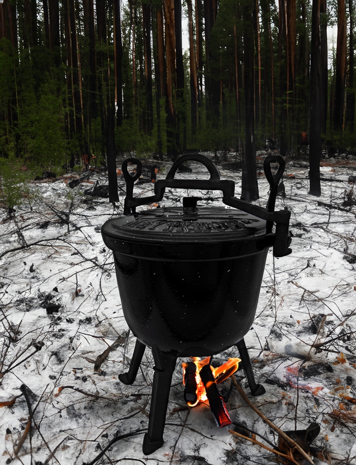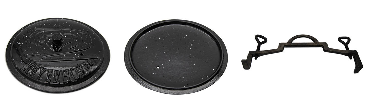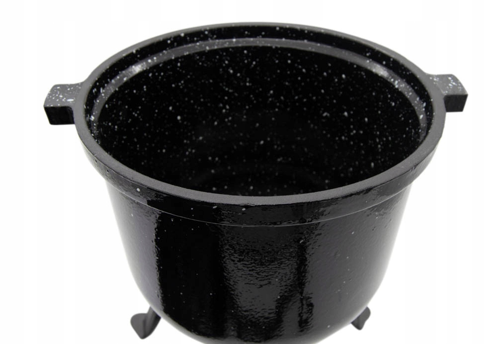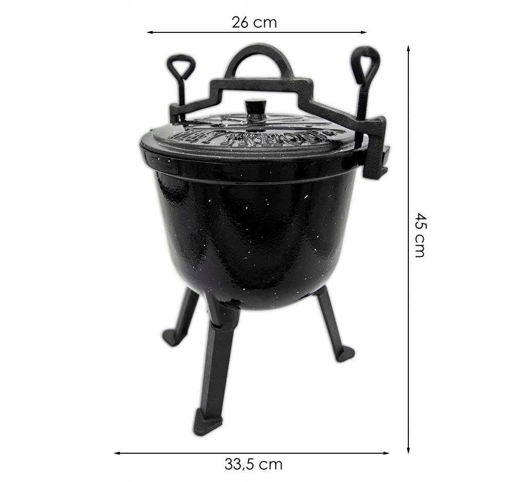 Оригінальний казан Meyerhoffзроблений з найякіснішого чавунного сплаву, стійкого до найвищих температур. Спеціальний вентиляційний отвір у кришці, який регулює тиск всередині казана, роблячи його 100% безпечним. Зсередини він покритий термостійкою емаллю, яка захищає і захищає внутрішню частину казана, що полегшує його миття і догляд (немає необхідності просочувати після кожного використання). Завдяки зручній ручці казан можна також підвісити над вогнем. Виріб має ніжки, що відкручуються, тому казан можна поставити в камін або прямо у вогнище. Завдяки тисненню на обкладинці ви можете бути впевнені, що купуєте оригінальний і безпечний продукт.