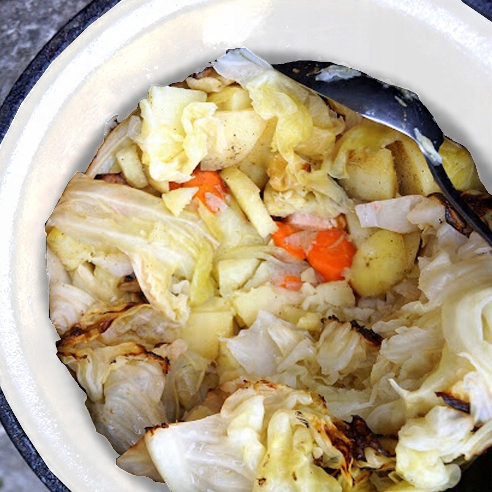Каструлю змастіть олією, на дно покладіть шкірку бекону, а потім вистеліть все капустяним листям. На дно викласти половину скибочок бекону, половину цибулі і квашеної капусти, посипаної кмином, і 2 товстих скибочки моркви. Щільно викладіть гомілки і накрийте залишилася цибулею. Зверху додати решту квашеної капусти, моркви та бекону. Залийте все пивом і накрийте капустяним листям.