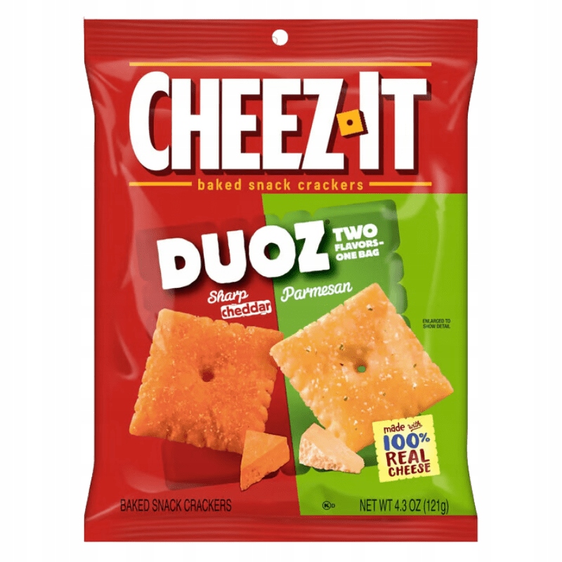 Cheez-It Duoz Sharp Cheddar & Parmesan — це практичний формат для вечірок, пікніків та ігор. В одній упаковці ви отримуєте чеддер і пармезан, тобто зручний сорт без компромісів. Ідеальний вибір, коли хочеться швидкого, смачного перекусу в стилі американської класики, який легко кинути в рюкзак або ланчбокс. Американські крекери в YUMMO!