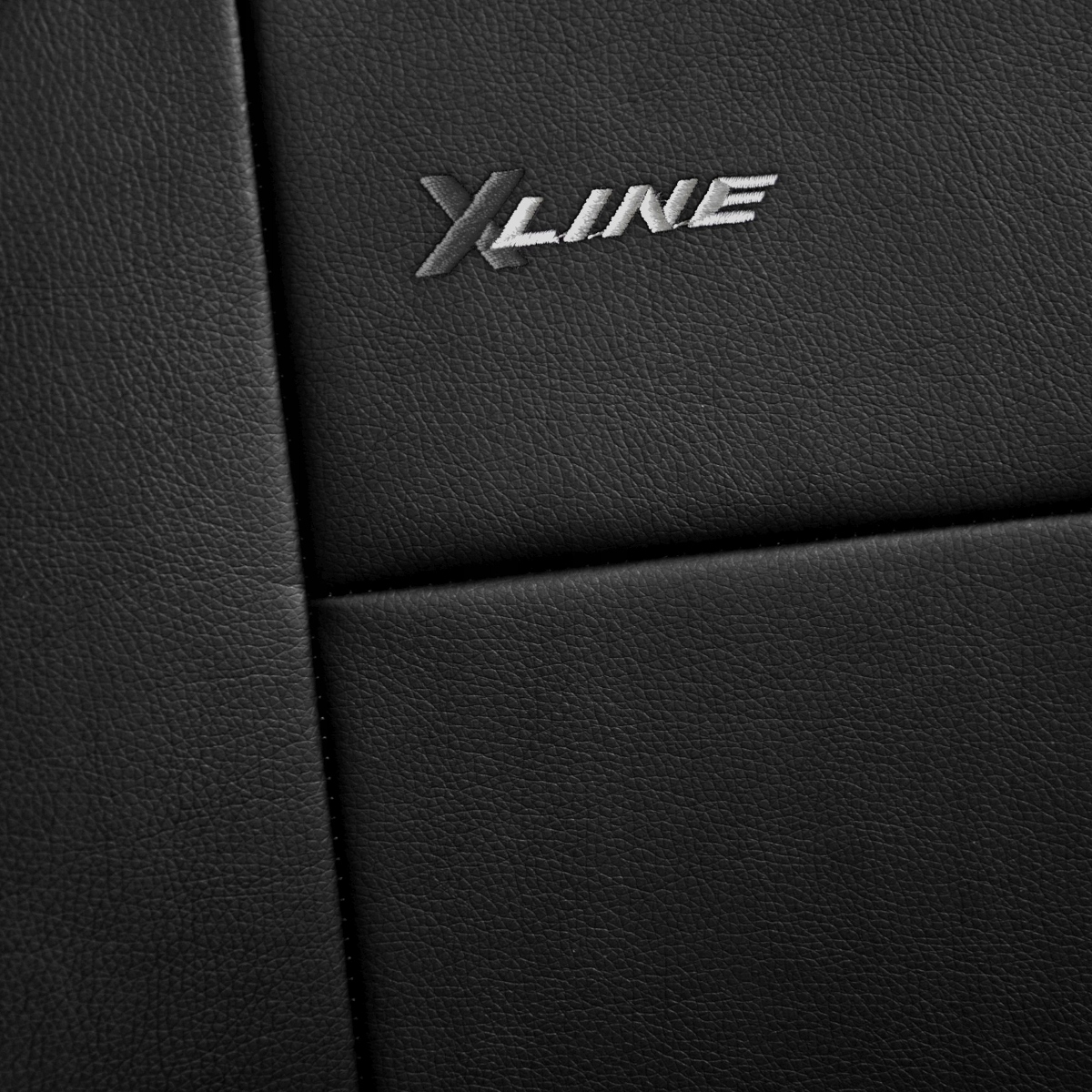 АвточохлиX-LINE виготовлені з високоякісної штучної шкіри. Лицьова частина чохлів виконана з міцного матеріалу, що складається з верхнього шару - штучної шкіри, і підкладки з функціями посилення і стабілізації. Зовнішній матеріал має високу стійкість до стирання, що забезпечує високу довговічність виробу. Задня частина чохла виконана зі східного оббивного матеріалу, ламінованого поролоном товщиною 2 мм. Чохли передніх сидінь прикрашені ніжною вишивкою, що відсилає до кольорів комплекту.