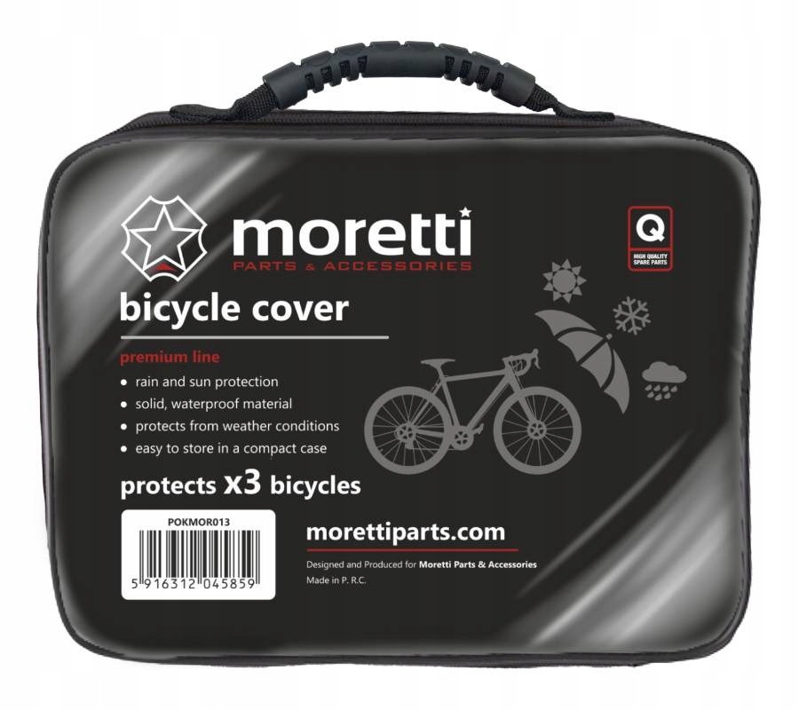 Високоякісний велосипедний чохол MORETTI з дуже міцного і стійкого до погодних умов матеріалу. У комплект входить чохол для чохла. Зроблено таким чином, що ми можемо легко покрити весь велосипед