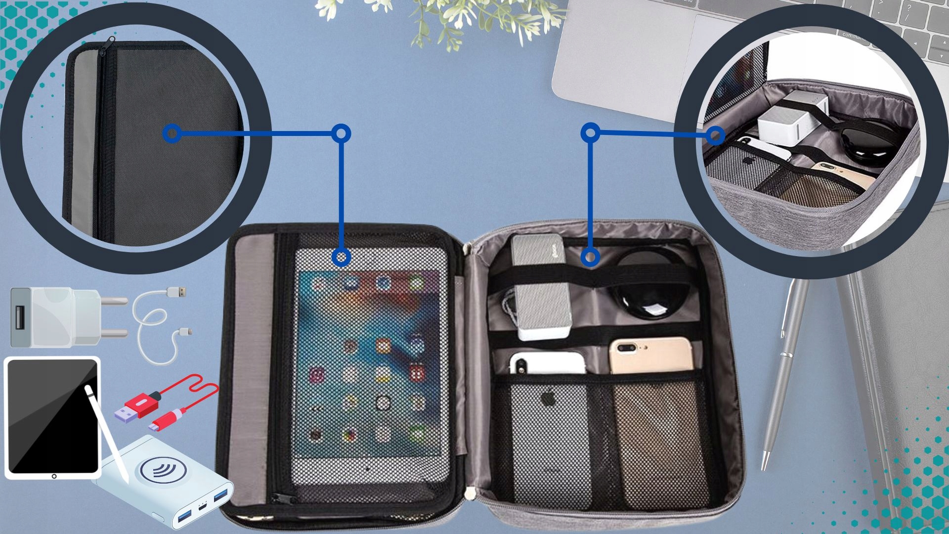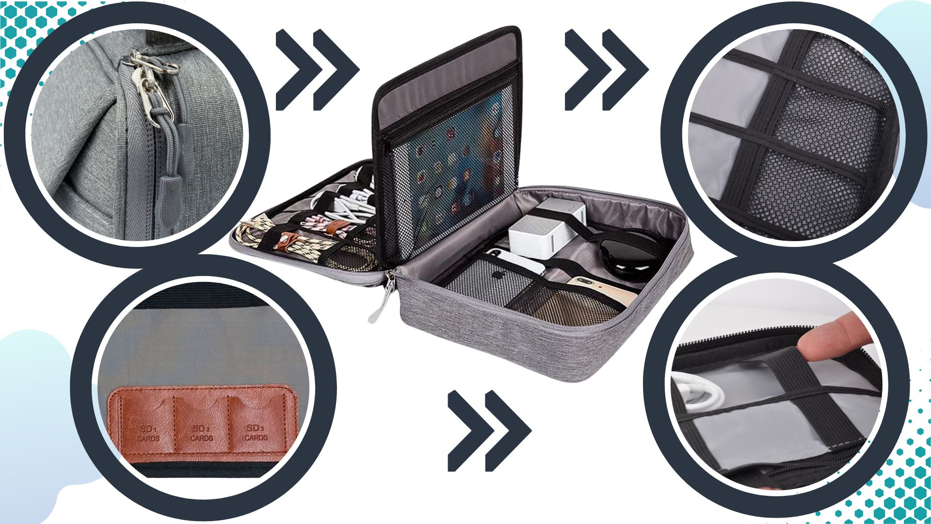 - ✅Місткий двошаровий дизайн - всередині багато місця для організації аксесуарів. Органайзер дозволить швидко знайти зарядний пристрій, USB-кабель, карту пам'яті або аудіокабель. Завдяки цьому ви можете швидко організувати свої зручні кабелі та зарядні пристрої.