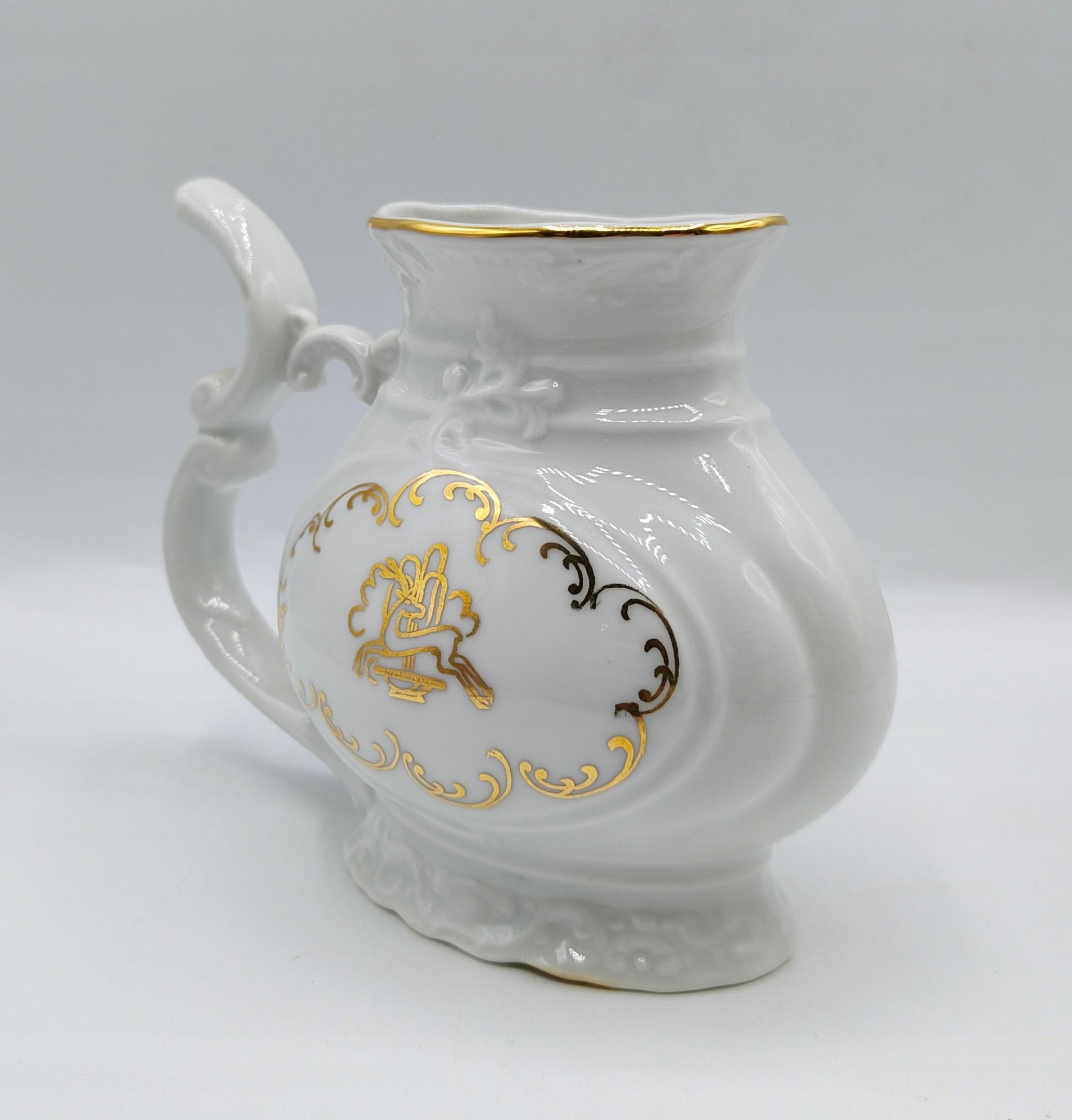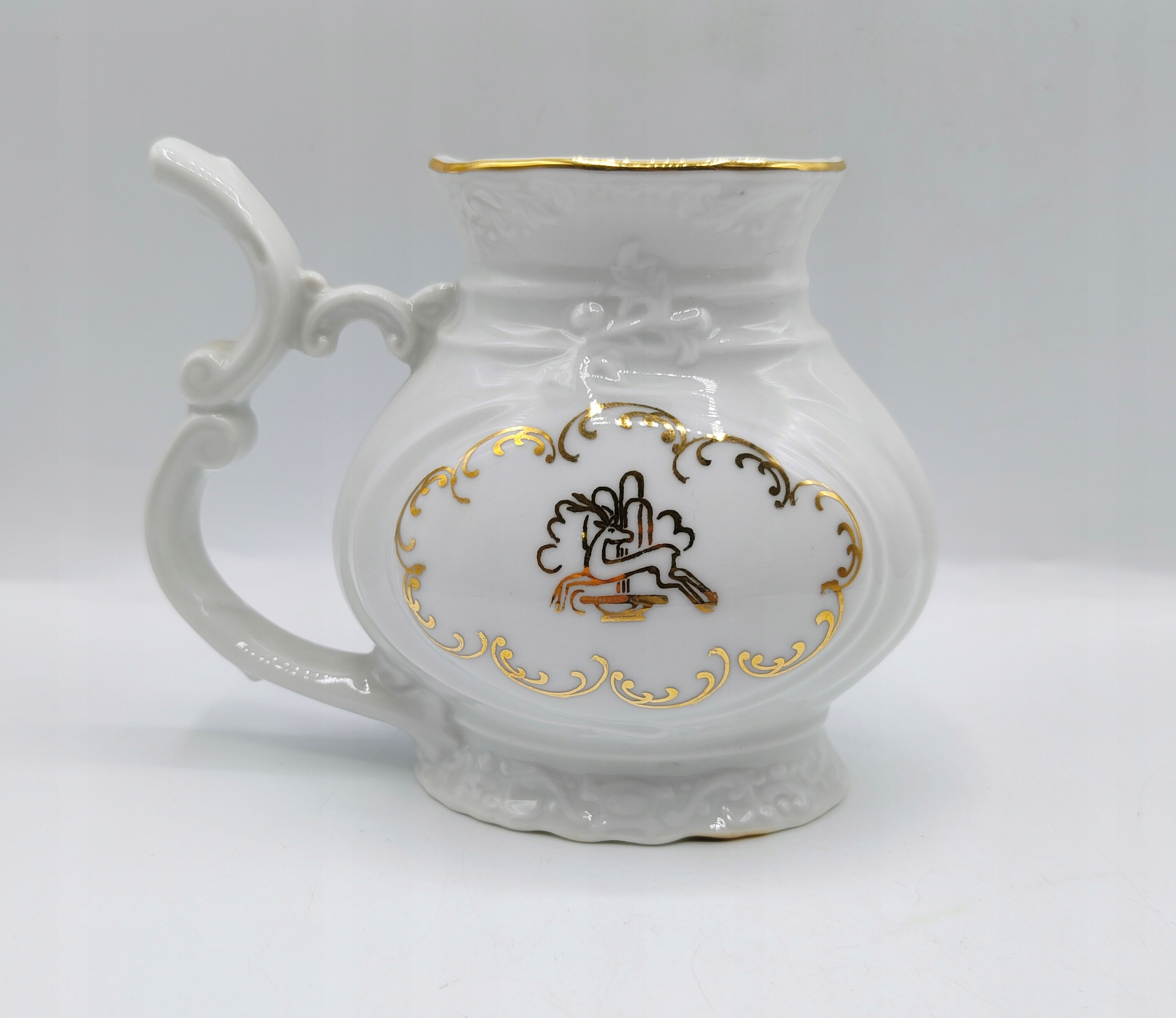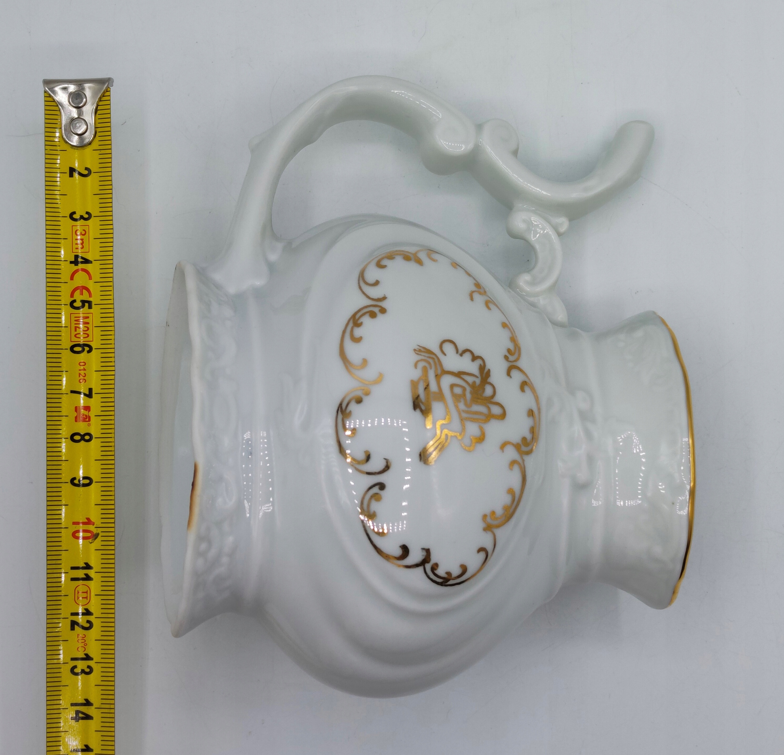 Це глечик/кухоль з ручкою для пити воду. Зроблено з порцеляни, позолоченого. Тема з підписом. Розміри: 14,2 см/11,5 см/7,8 см, ємність 350 мл, важить 210 г. Дуже добре зроблено.