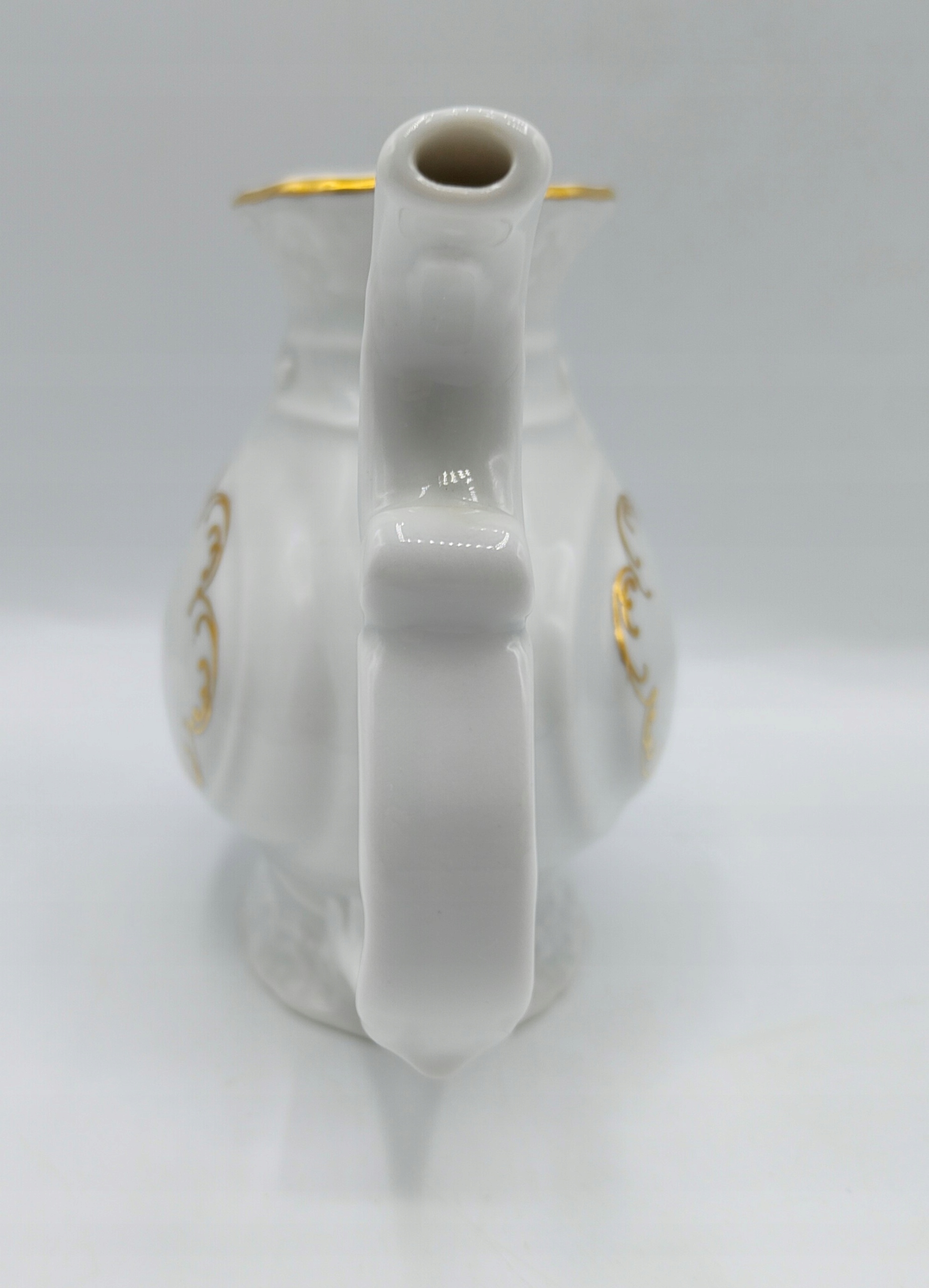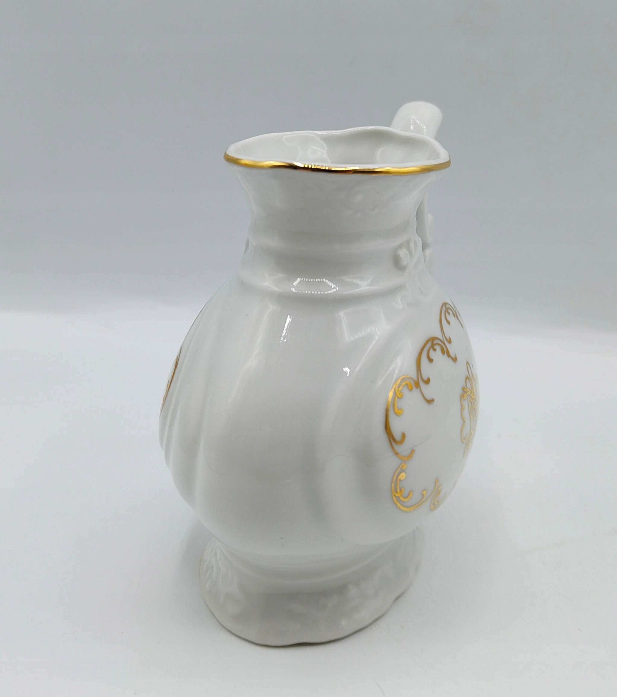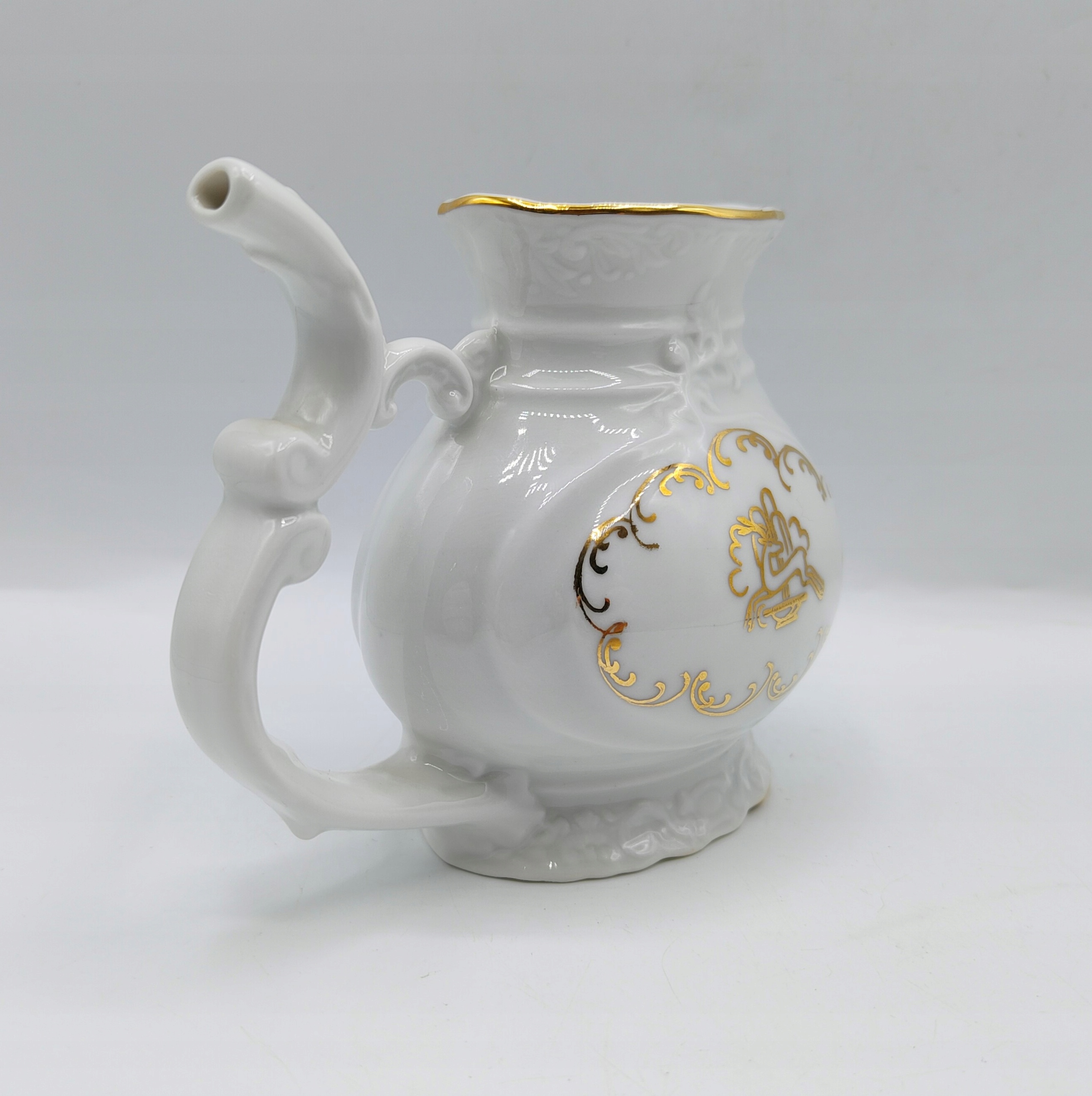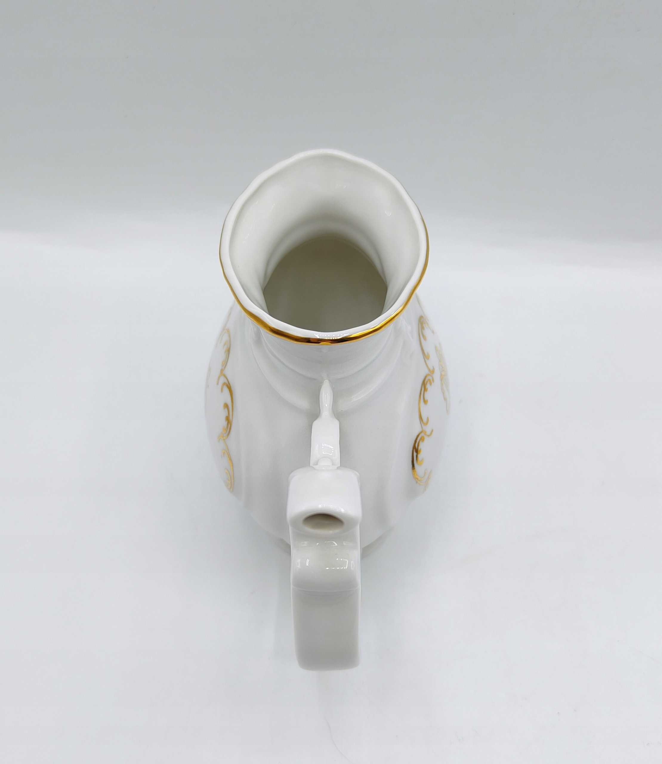 Це глечик/кухоль з ручкою для пити воду. Зроблено з порцеляни, позолоченого. Тема з підписом. Розміри: 14,2 см/11,5 см/7,8 см, ємність 350 мл, важить 210 г. Дуже добре зроблено.