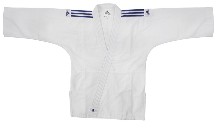 Кімоно тільки доступний в білому кольорі. Гладкі нашивки з синіми смужками і логотипом adidas на плечах.