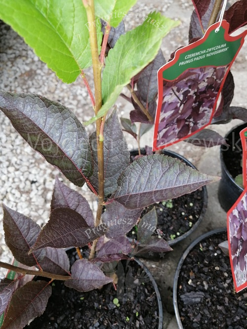 Черемха новосибірська - Prunus padus (контейнер С3) дерево з потужним ростом і овальною кроною, що досягає близько 4 м у висоту. Дуже великі, темно-фіолетові, овальні листя.