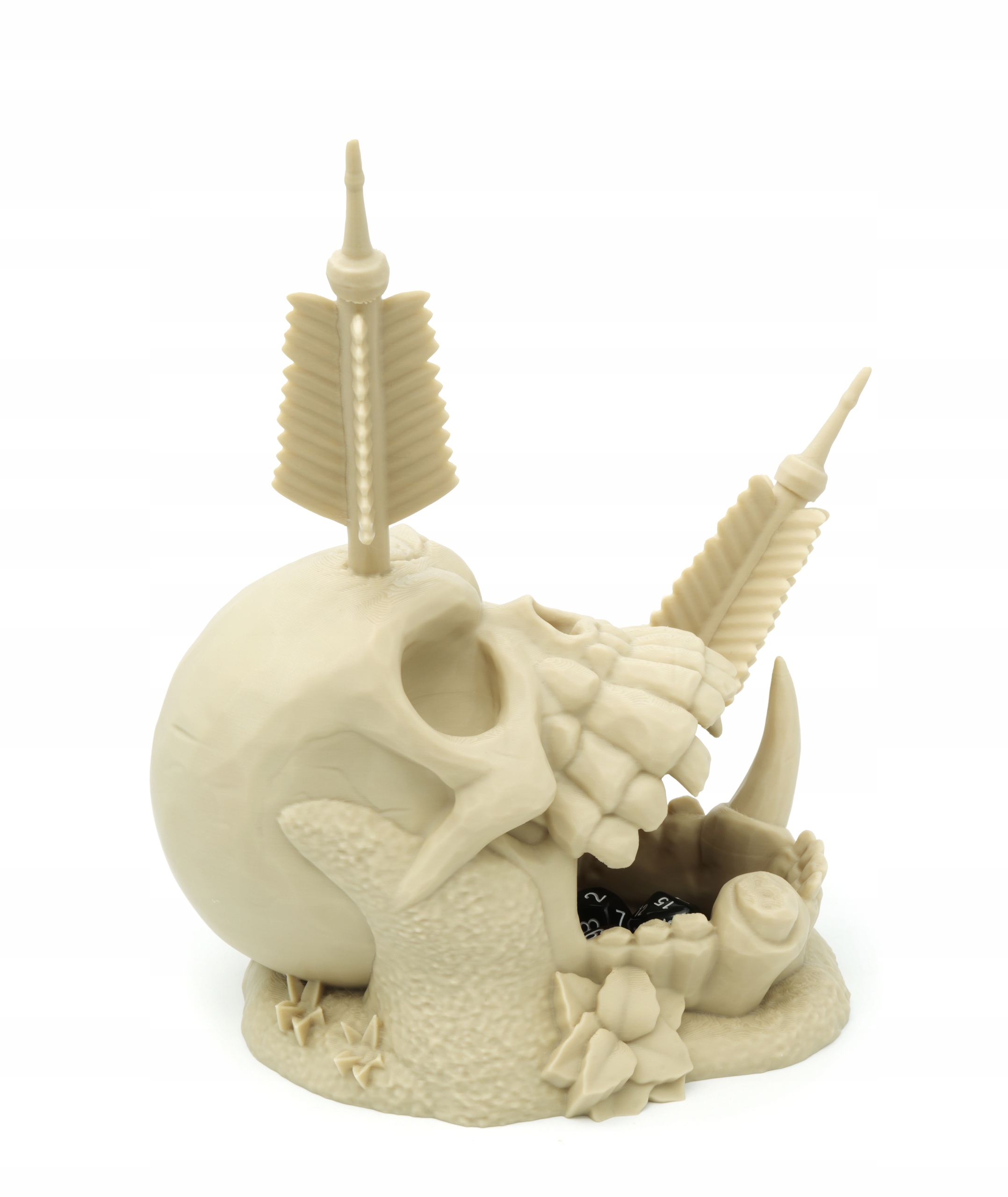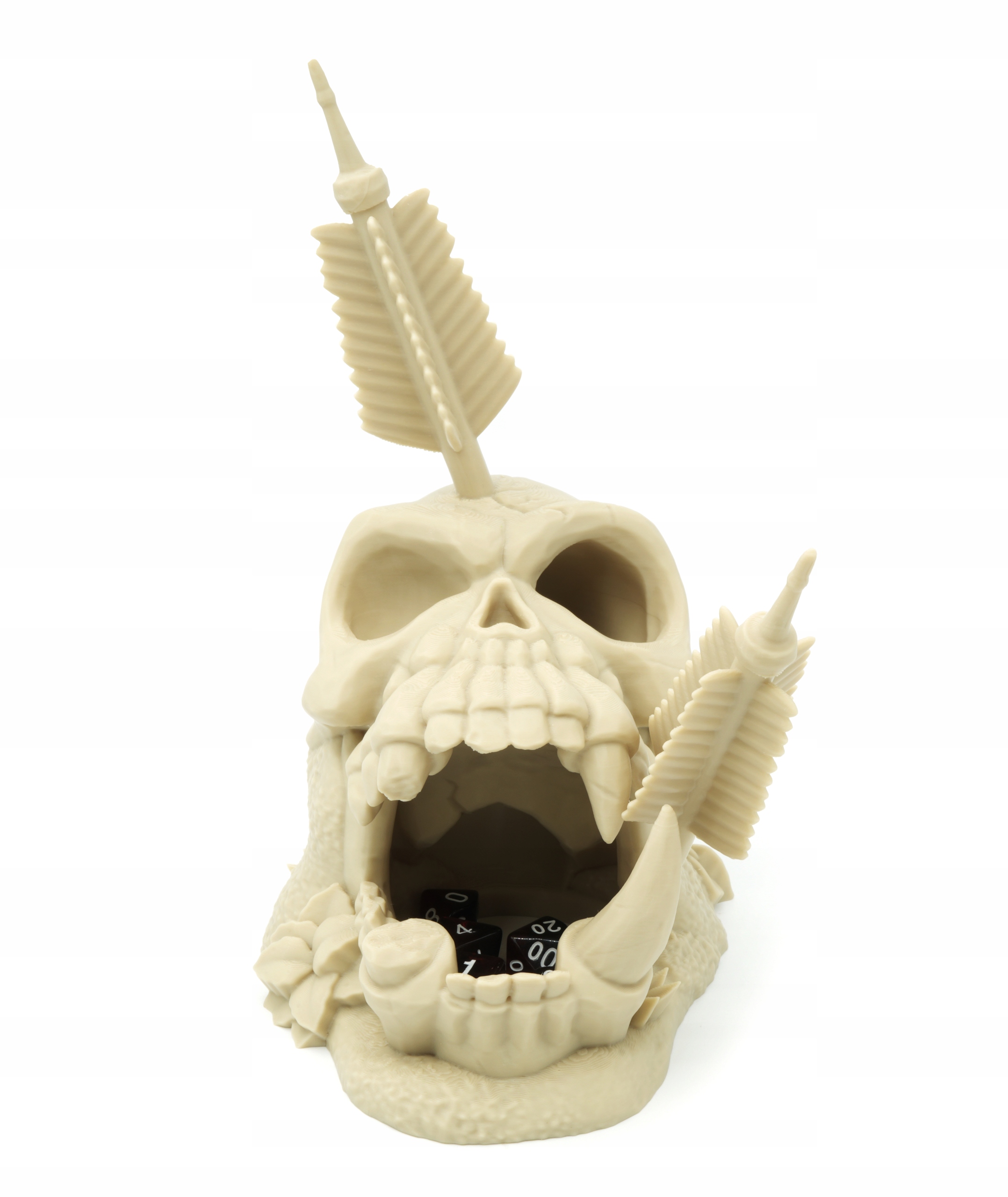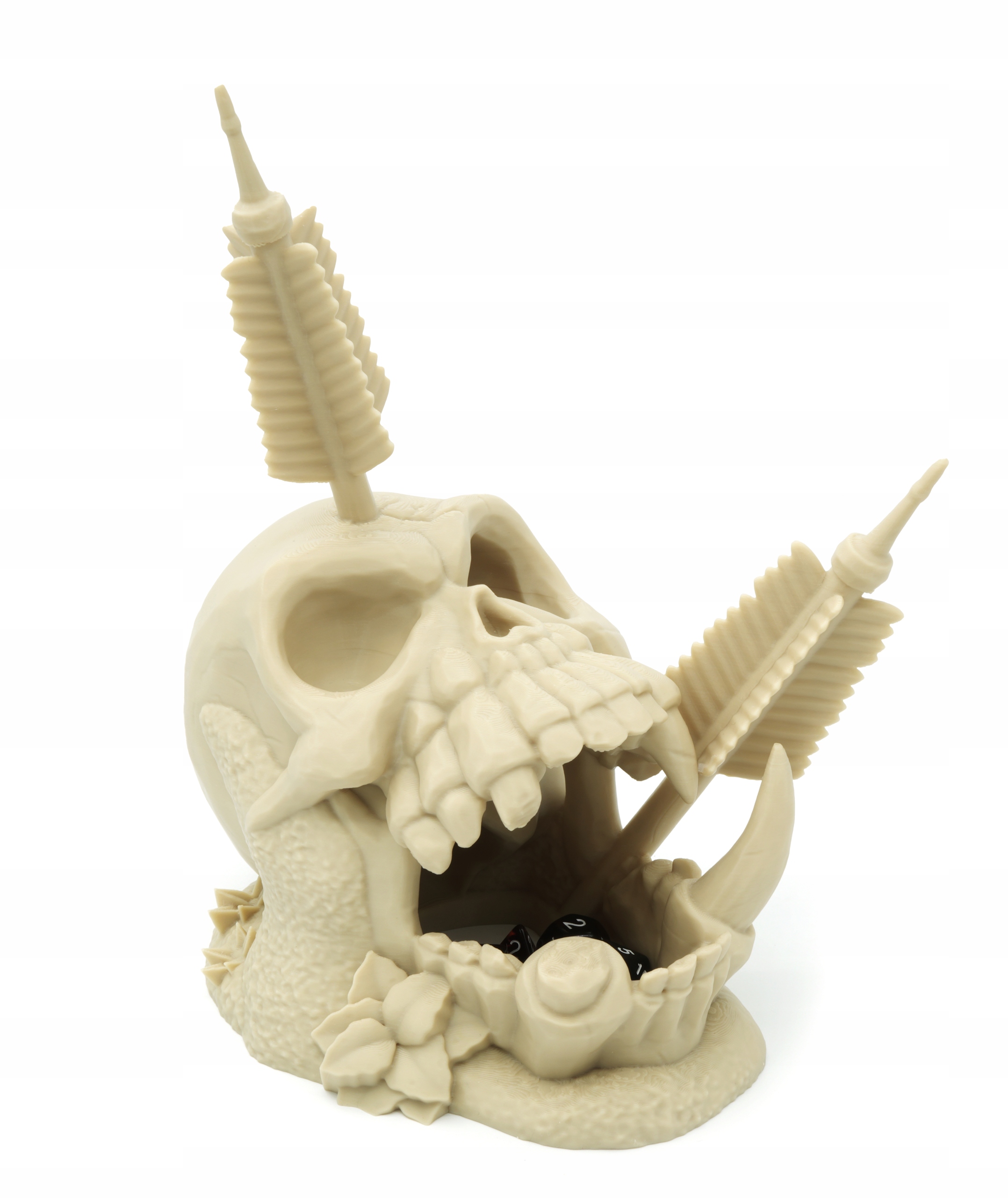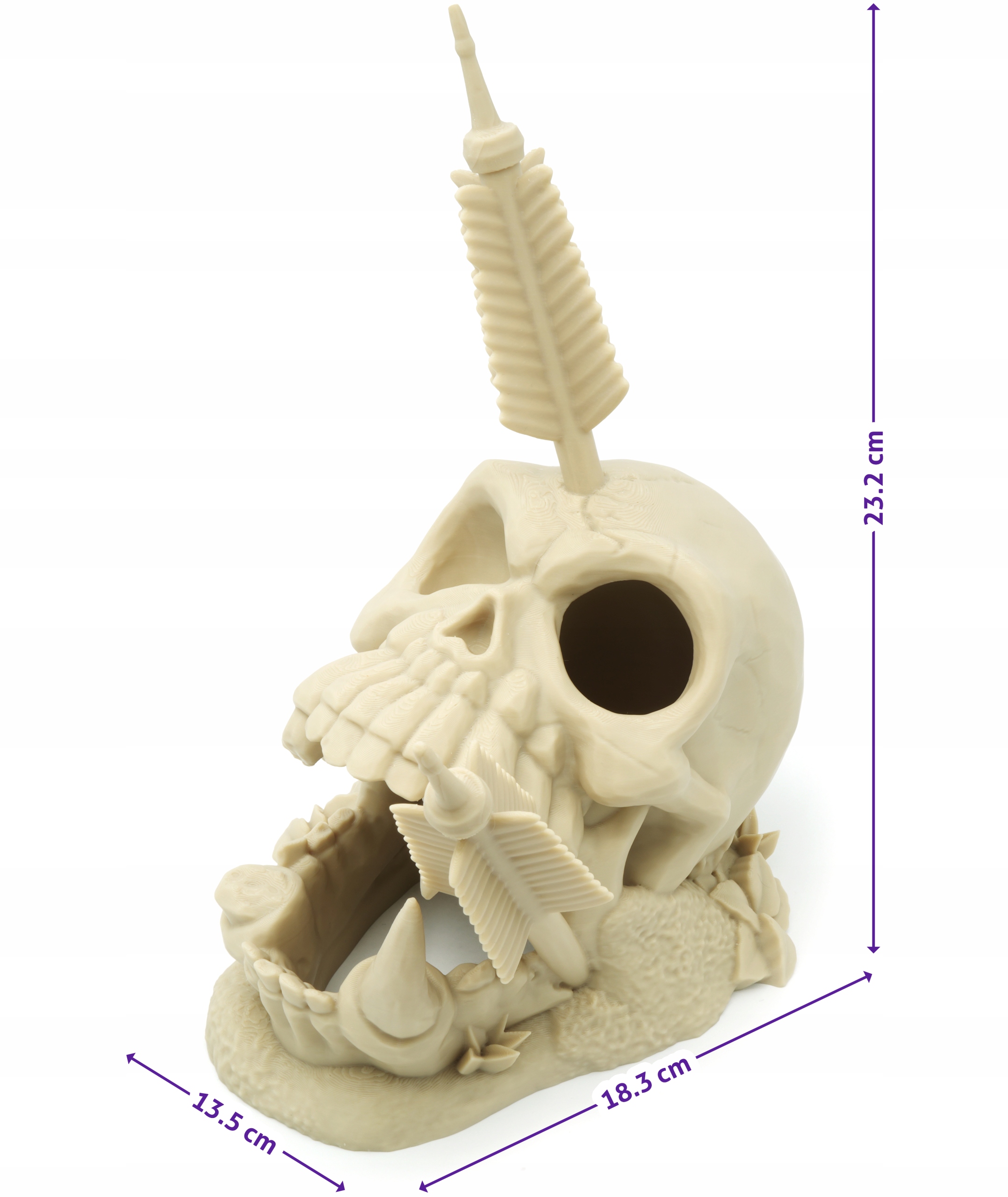 Цей унікальний дизайн представляє реалістичний череп з однією стрілкою, що застрягла між очними розетками - прикрашені пір’ям - і другий в основі , на якій ціле. Але також вражаючий прикраса таблиці. 🎲💀🏹