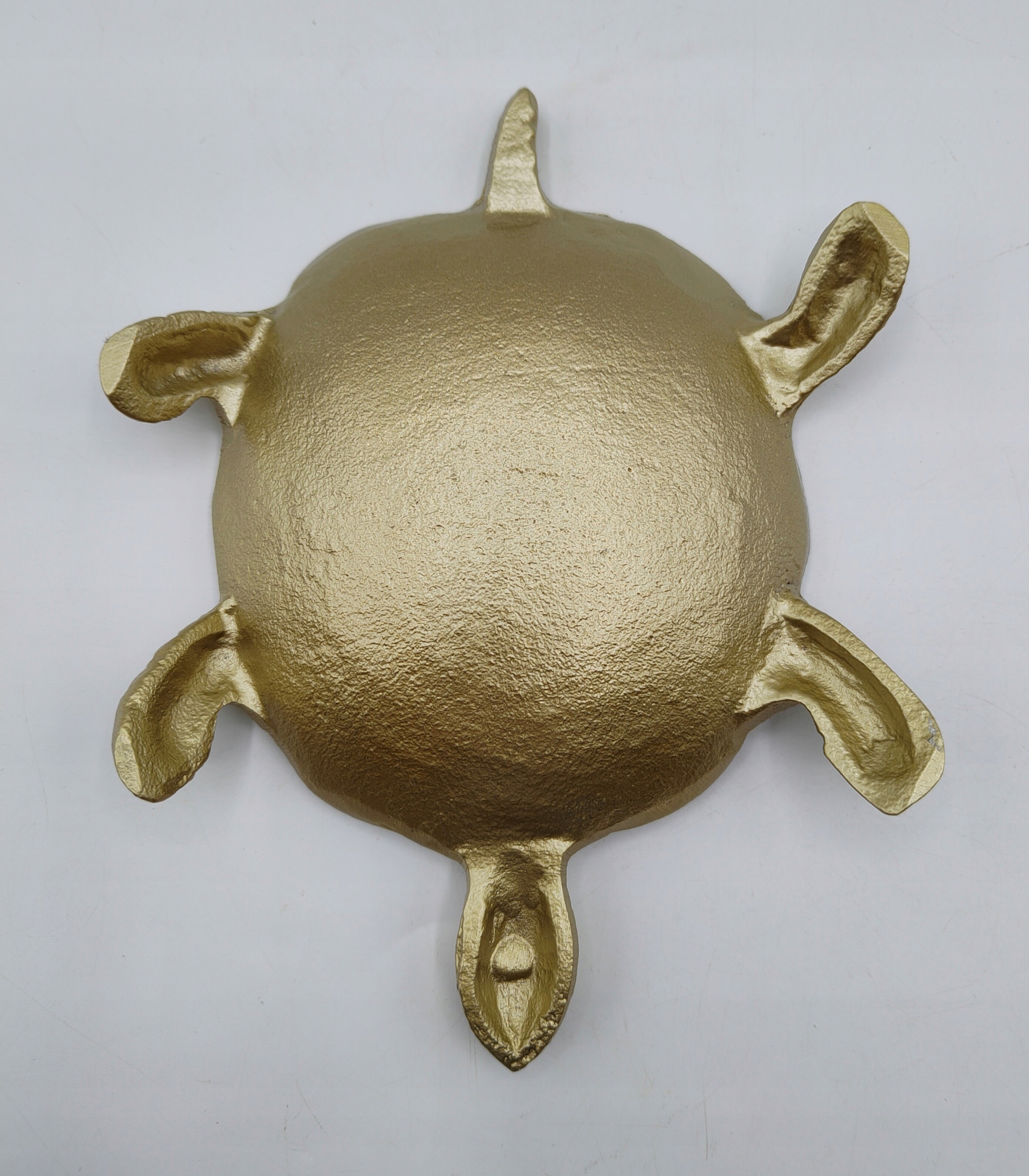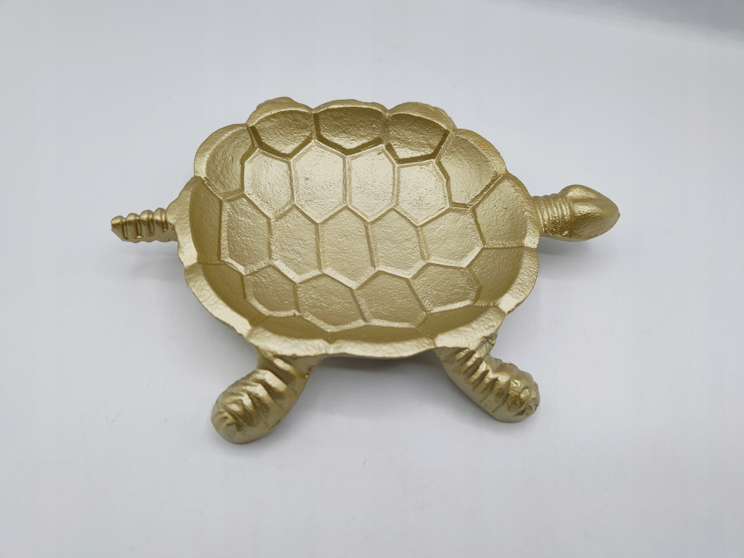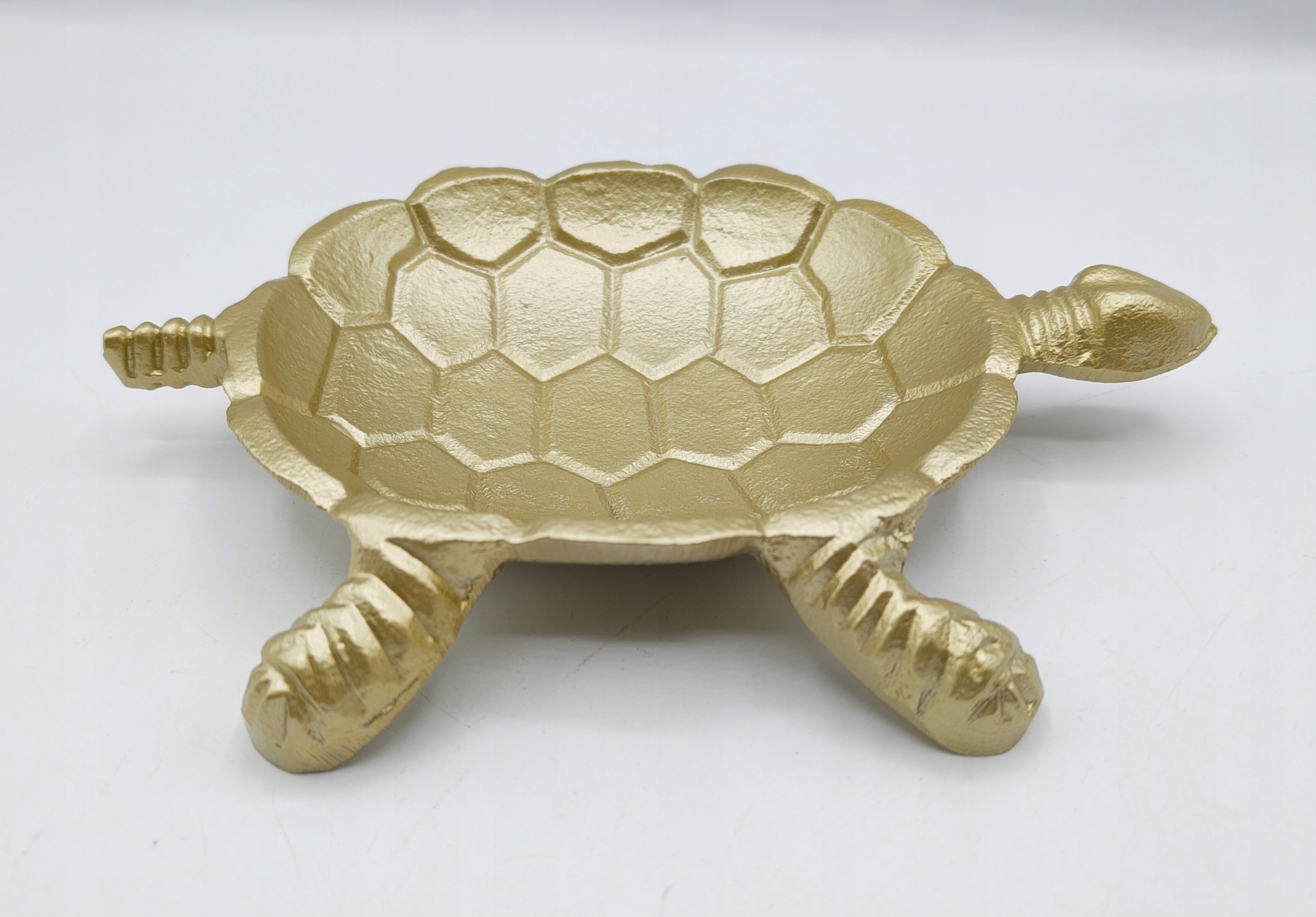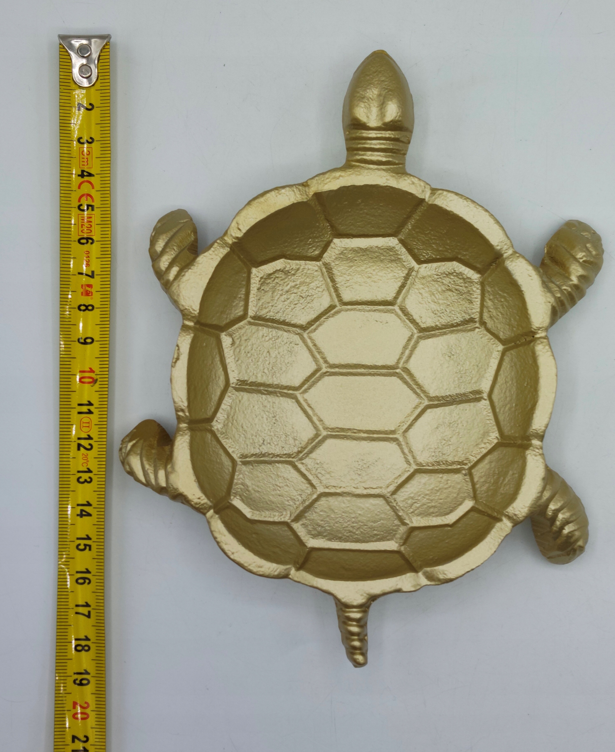 Черепаха виготовлена з нержавіючого металу (імовірно, литий алюміній, пофарбований золотом)/ Розміри: 18 см/14 см/3 см, вага 180 грамів. Черепаха в житті виглядає так само красиво, як і на фотографіях. Його можна використовувати як підставку або як колекційну фігурку. РЕКОМЕНДУЮ.