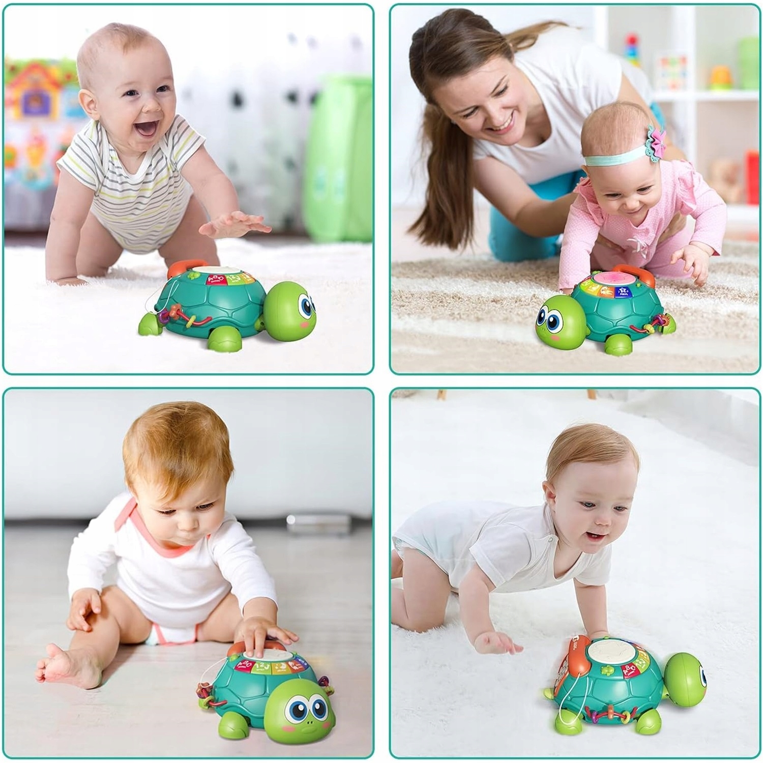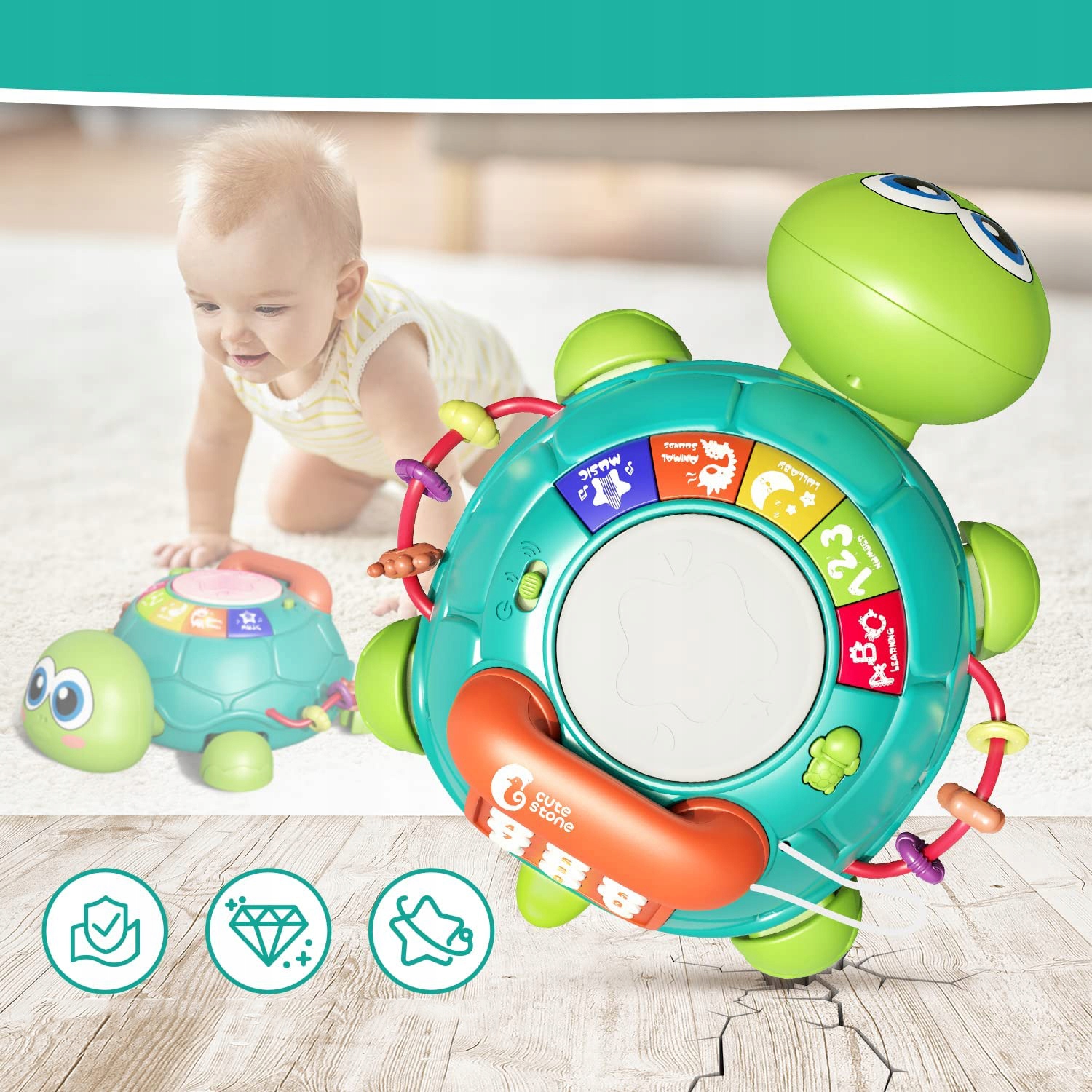 🐢🐢🐢【Функції звуку, світла та музики】Від кнопок із візерунком черепахи, барабаніння рукою до кнопок аналогового телефону – залежно від натискання кнопки відтворюються різні звуки (наприклад, колискові, звуки тварин, звуки барабанів, звуки інструментів, алфавіту та дзвіночки). Ви також можете регулювати гучність.