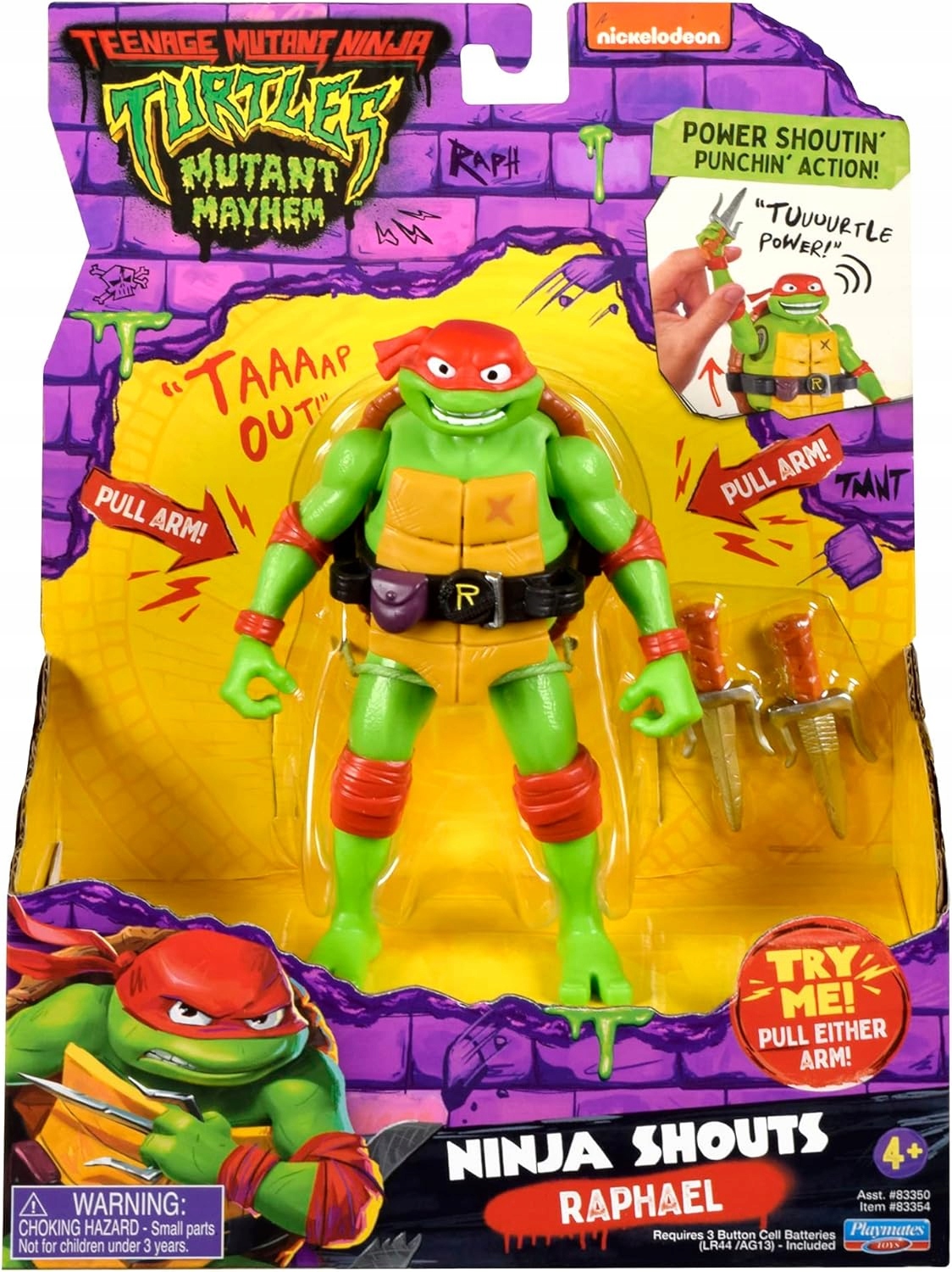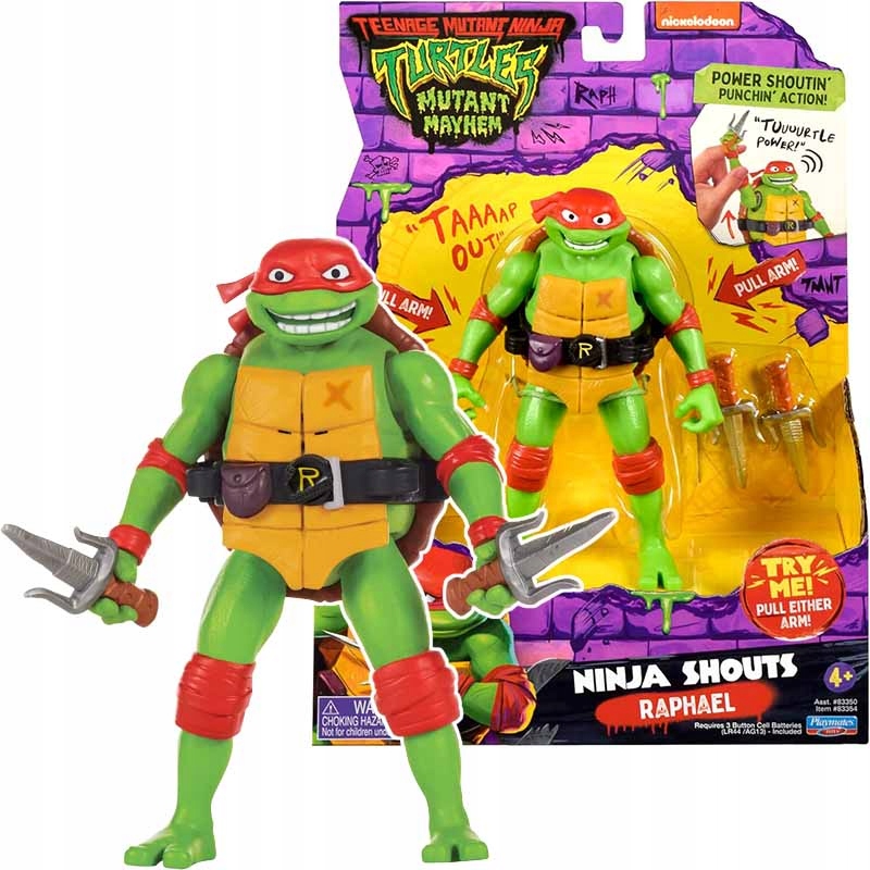 Привіт, 14-сантиметрова фігурка Ніндзя кричить Донателло, і він крикне у відповідь своїм автентичним голосом у кіно! Рафаель має амбіційний настрій і великі мрії, які полягають у тому, щоб (без певного порядку) вдарити когось так сильно, що його вирве, і стати бійцем змішаних бойових мистецтв. Разом він і його брати залишають каналізацію та прямують до міста нагорі, борються зі злочинністю та дізнаються, що в команді немає «я» (хоча Раф наполягає, що технічно «я» в ній є). Відтягніть його руку або ногу, щоб почути дев'ять фраз або п'ять звукових ефектів! Тримайся, і все пекло розірветься, або повтори те, що він каже!