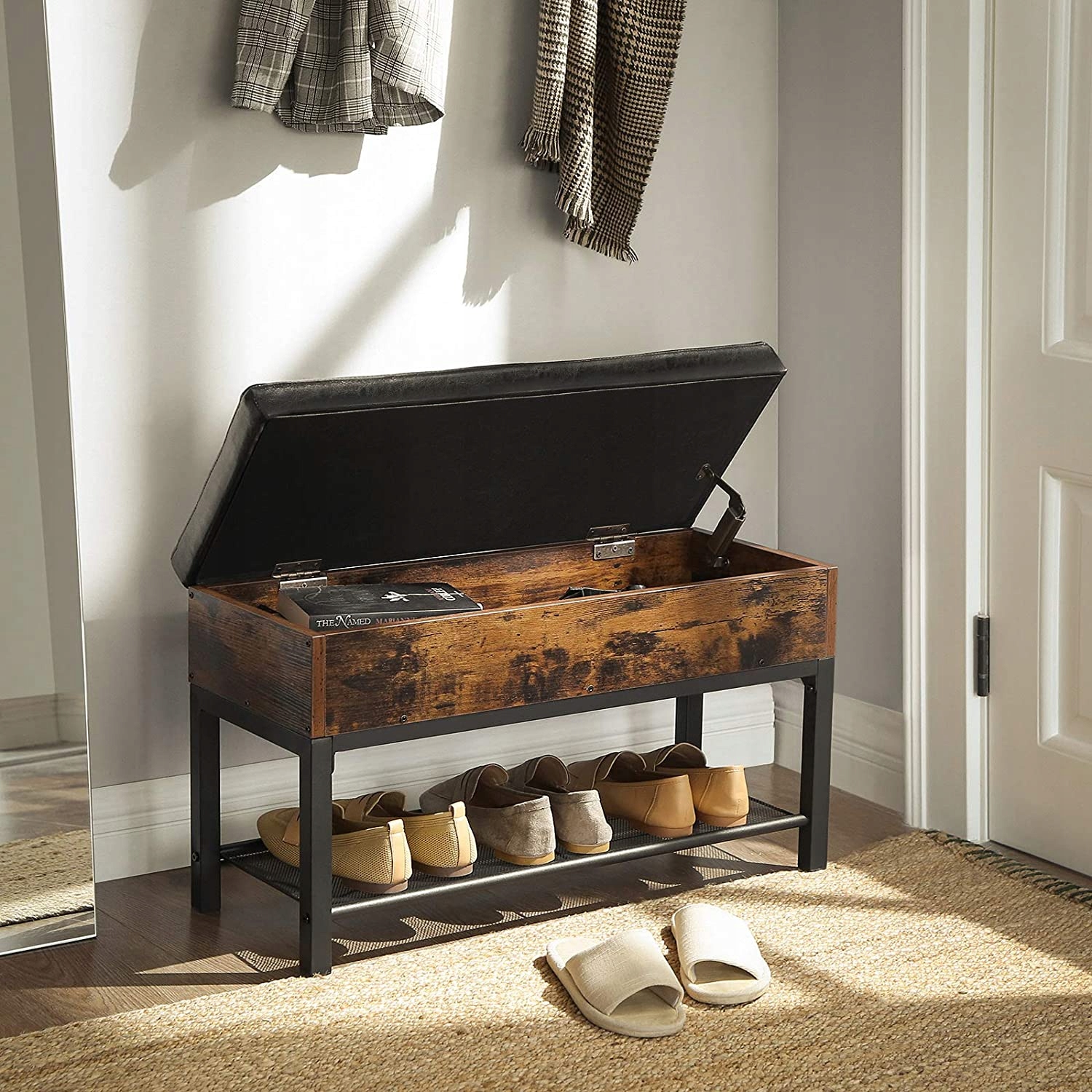 Шафа для взуття з сидінням на сталевому каркасі стане, крім усього іншого, чудовою прикрасою з елементами рустика. Зручне сидіння з товстою оббивкою прикрасить передпокій і полегшить взування. Тумбу для взуття також можна використовувати як лавку з місцем для зберігання. Завдяки регульованим ніжкам тумба для взуття не рухатиметься навіть під час щоденного використання.