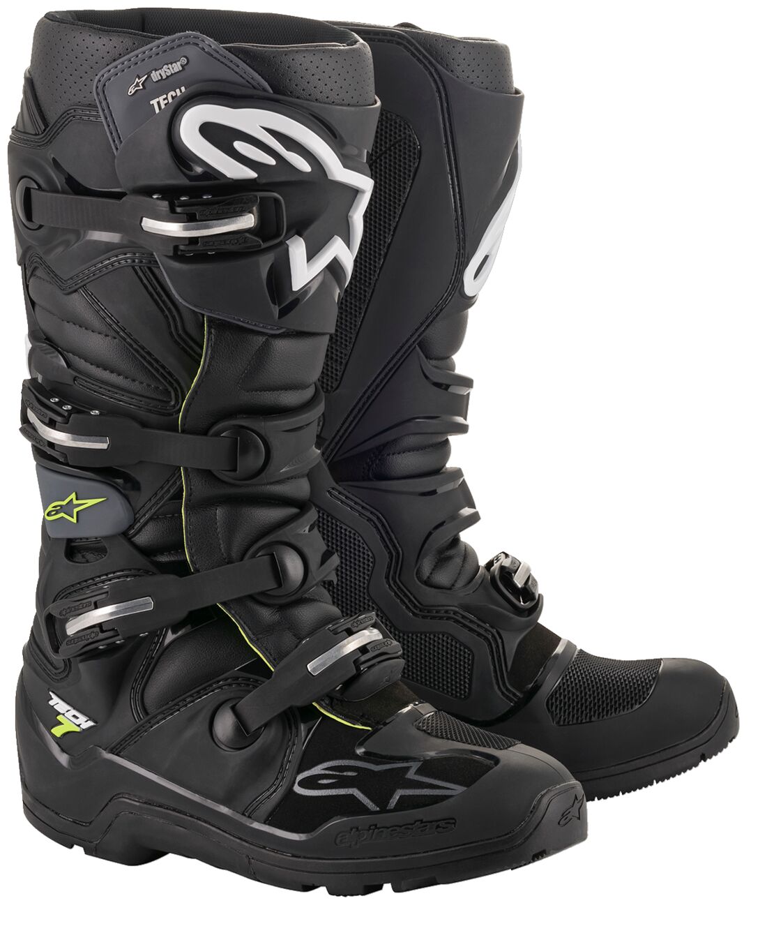 Вони мають сертифікат CE. Вони підтримують стабільність і гнучкість завдяки біомеханічній системі управління крутильними рухами. *Tech 7* також має найкращий захист щиколотки. Взуття розроблено для забезпечення максимального відчуття, контролю та контакту з мотоциклом. Інноваційна система кріплення пряжок Alpinestars дозволяє швидко і точно застібати взуття. Ми будемо раді повторити це знову: