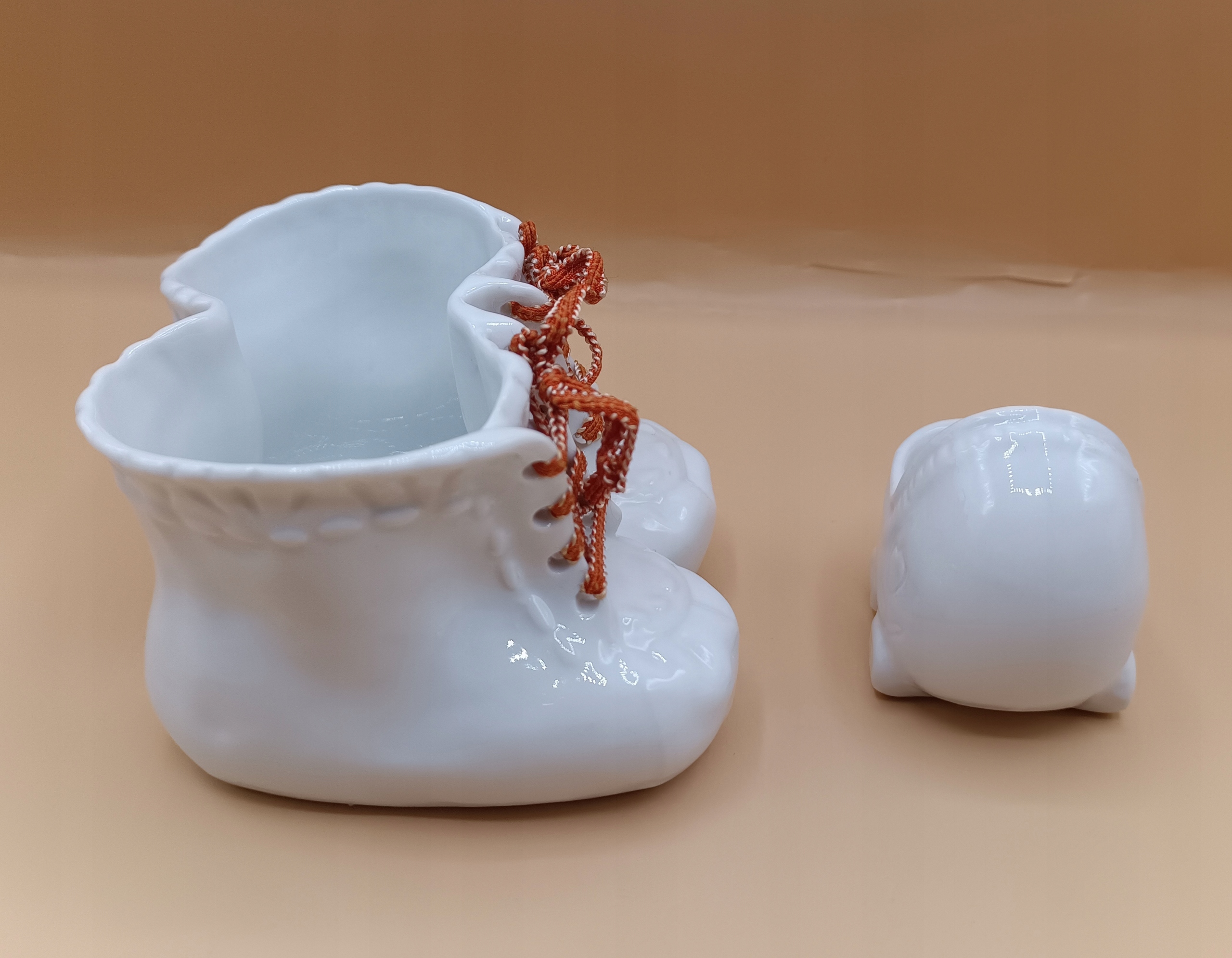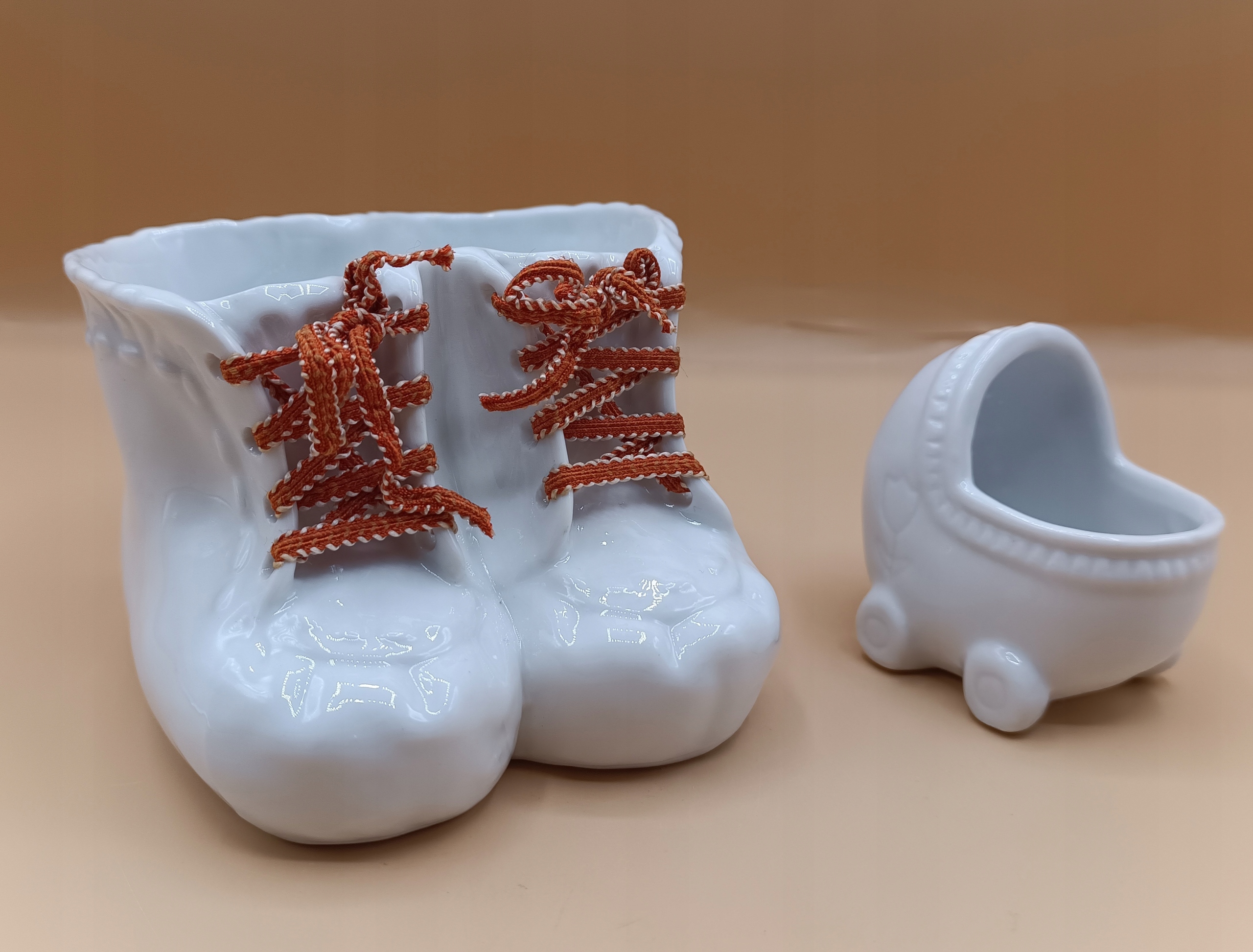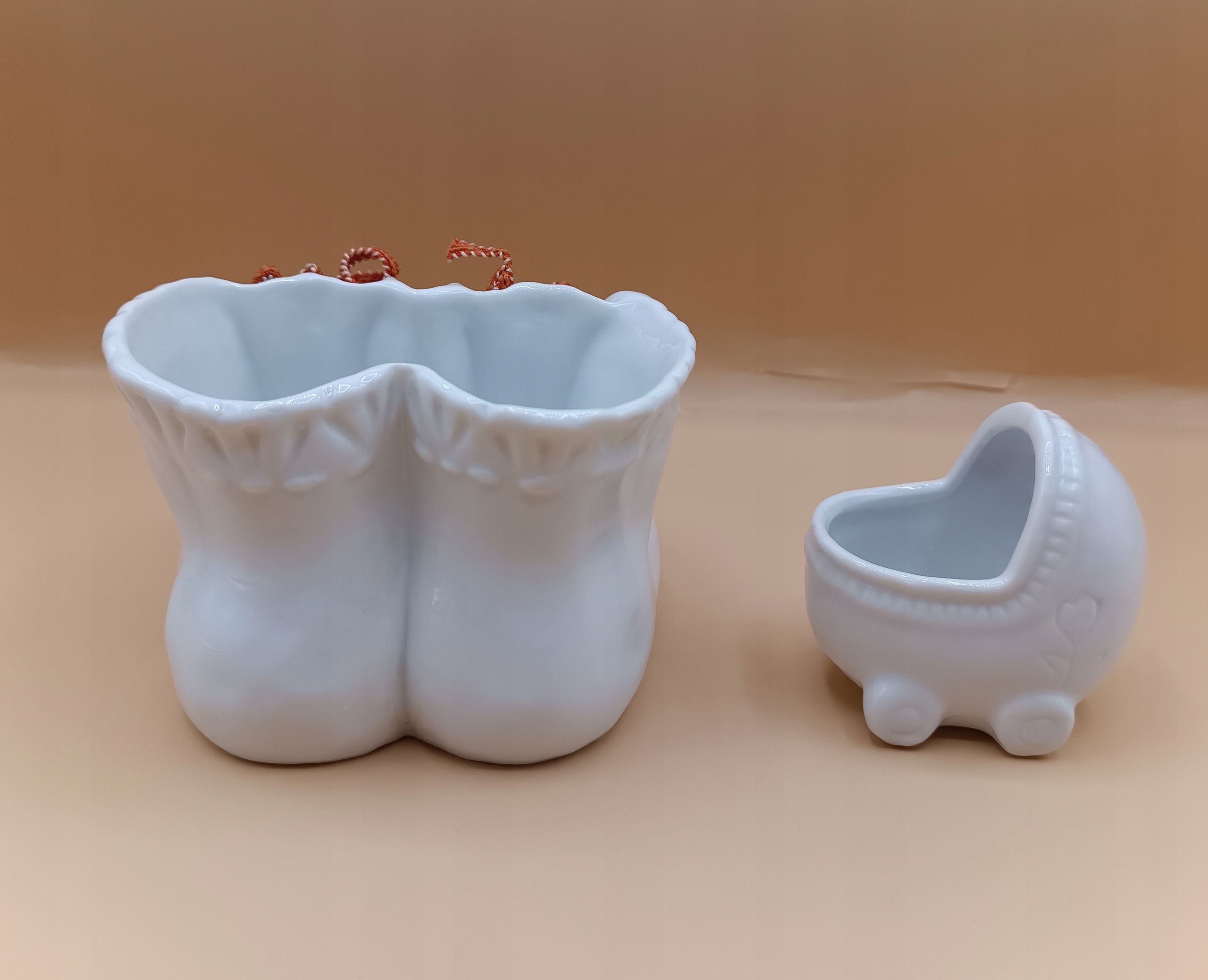 Черевики та коляска для дитини, білі порцелянові контейнери - красиві