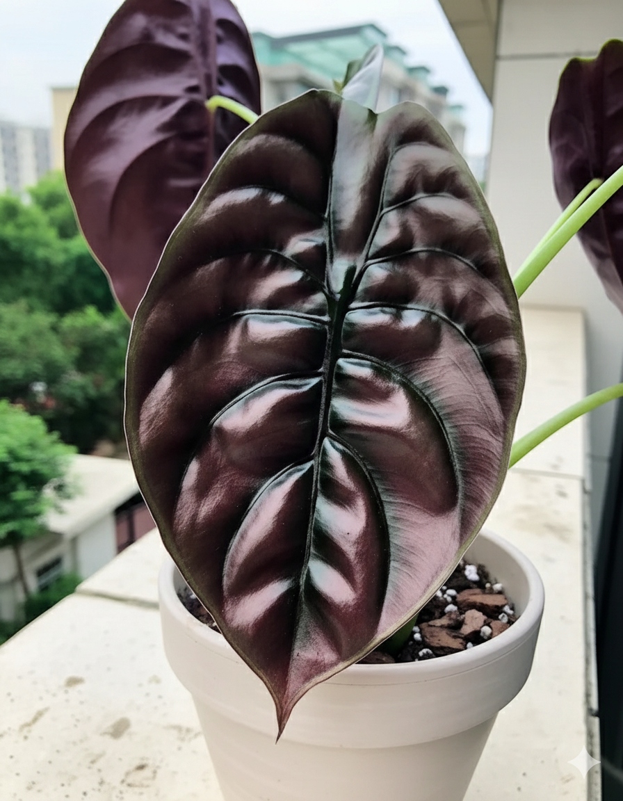 Alocasia cuprea 'Red' - справжній скарб для колекціонерів і любителів екзотичних рослин! Цей сорт радує своїм листям, схожим на витвори мистецтва з вигадливою різьбою. Їх глибокий мідно-червоний відтінок із металевим блиском і чітко вираженими темними жилками робить рослину неперевершеної краси.