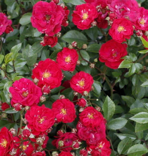 різноманітність троянд, який може бути кваліфікований як мініатюрний, знижка та ґрунтовий покрив. Квіти -це вишнева, сяюча, маленька, діаметр близько 4 см, напів -повні, широко відкриті, погано ароматні, у дуже великих суцвіттях на вершинах пагонів. У другій половині червня дуже рясно цвіте, а потім суцвіття в меншій чи більшій кількості з’являється до осені. Листя темно -зелені, блискучі, маленькі, густо розташовані на пагонах. Постріли нахиляються під вагою квітів набік, розкидаючи чагарники, висота близько 40-80 см.